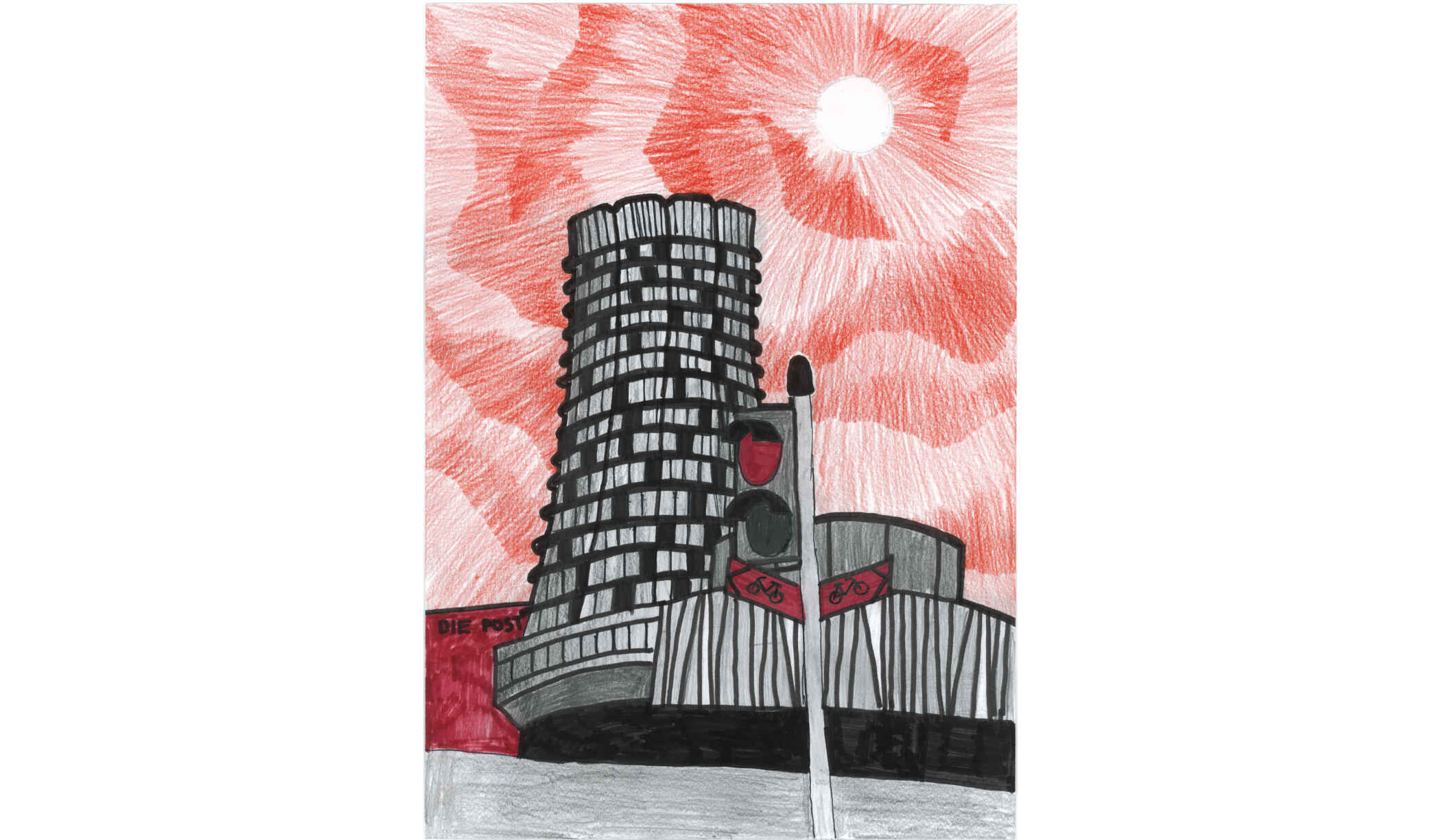 - Für deine Zeichnung nimmst du ein weisses A4-Papier. Du darfst Bleistift, schwarze und rote Farbe verwenden