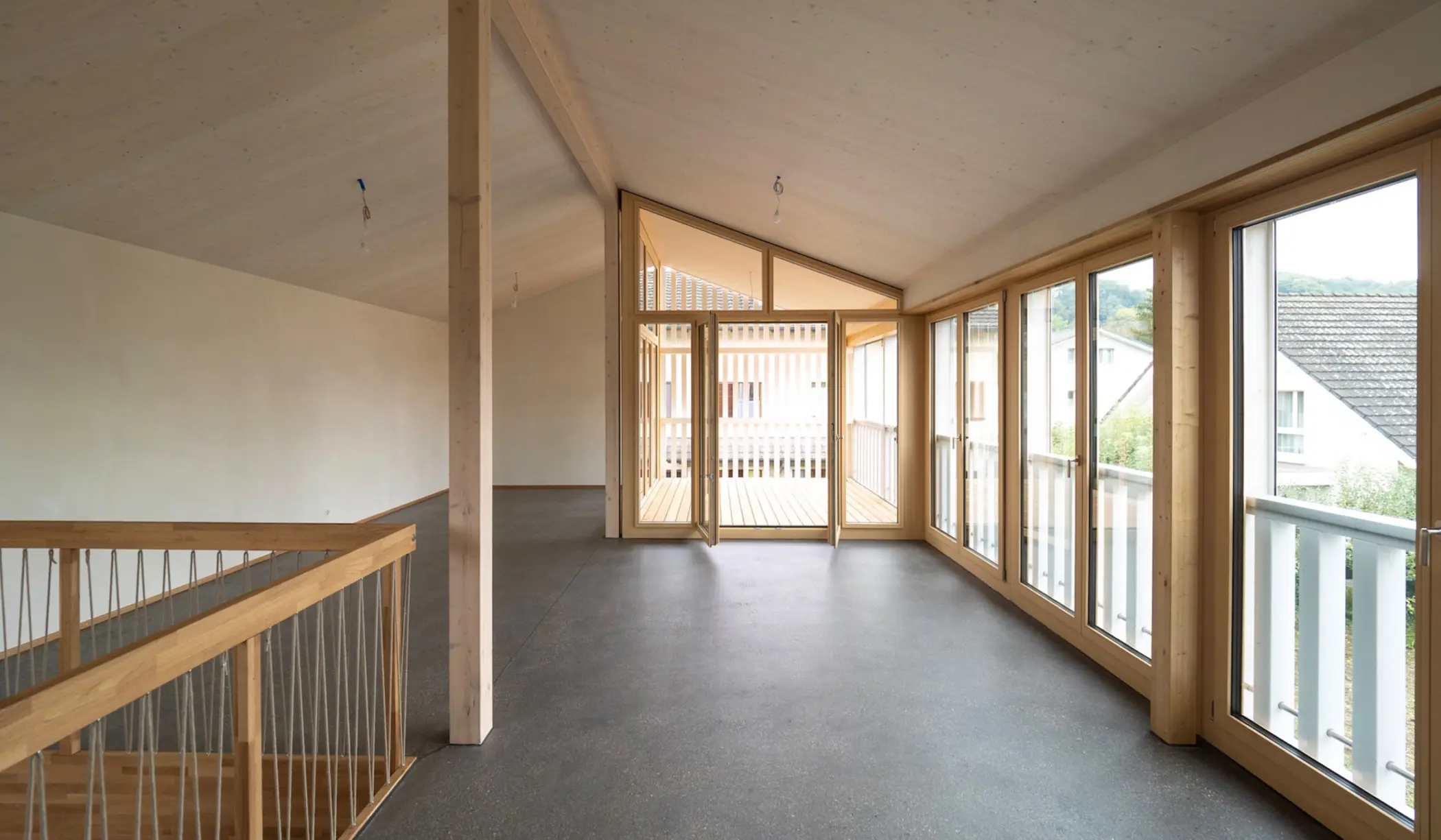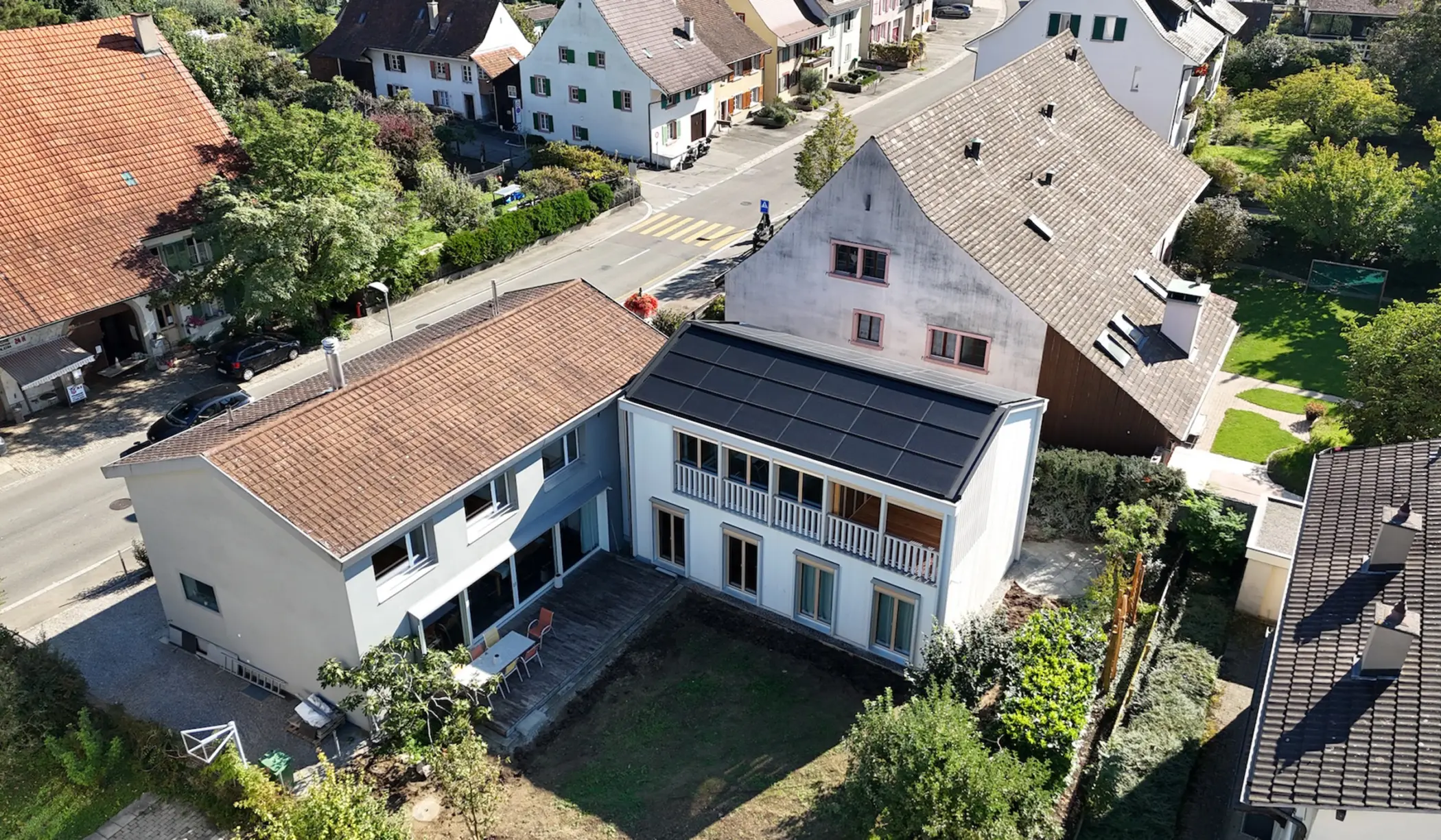 Mittlerweile in der ‘empty nest’-Phase angekommen und mit Blick auf eine altersgerechte Wohnsituation gehen die Überlegungen der Auftraggeberschaft in Richtung einer horizontalen Erweiterung des Hauses, was ihnen die Möglichkeit gibt, auf einer Ebene zu wohnen und das darüberliegende Geschoss zu vermieten. Verdichtung und Barrierefreiheit in einem Zug. Dies ist mit einem hölzernen Anbau – der kleinen Schwester – geschehen. Auch dieses Haus ist entspannt gesetzt, schafft einen schönen neuen Garten, auch hier wird die Wasserführung des (Solar)Daches ein Thema. Das Thema der historischen gemauerten und strassenbegleitenden Häuser mit den gartenseitigen Holzscheunen wird aufgenommen und in einem neuen Zusammenhang diskutiert. Eine differenziert entwickelte Holzfassade reflektiert den kleinteiligen Ort.