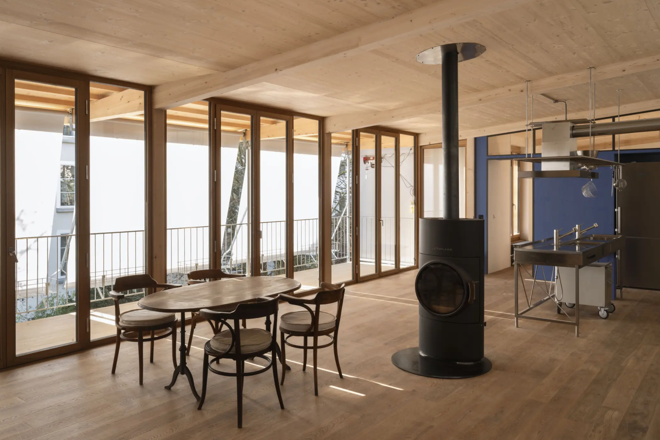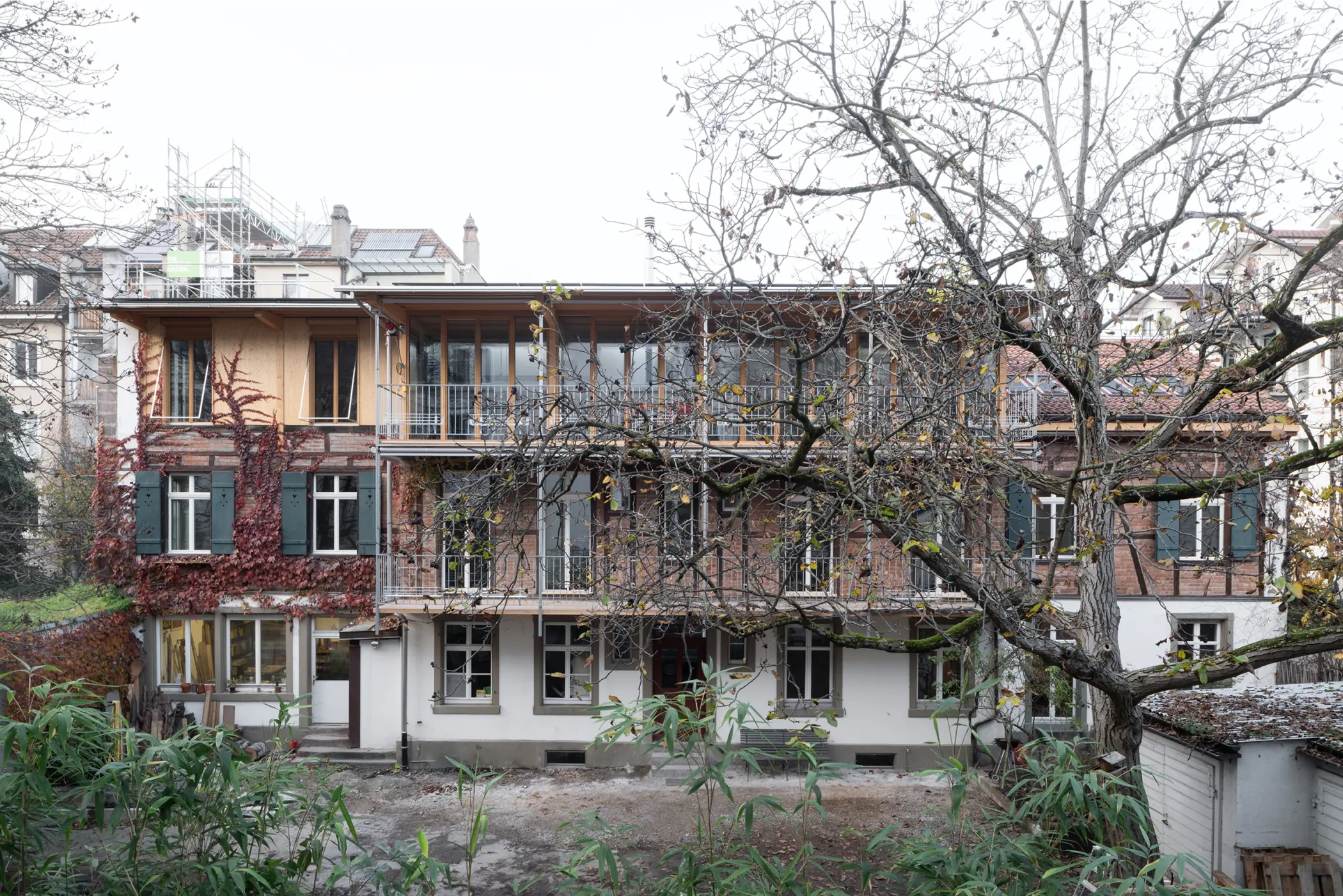 Die Aufstockung am Bläsiring 15b zielte darauf ab, ein denkmalgeschütztes Ensemble behutsam nachzuverdichten, ohne die gewerbliche Erdgeschossnutzung des Innenhofs zu verlieren. In enger Abstimmung mit der Denkmalpflege wurde ein Konzept realisiert, das den Erhalt der gewerblichen Nutzung zur Bedingung machte, um der Verdrängung durch Wohnraum entgegenzuwirken. Inmitten der grünen Hofsituation wurde der Bestand durch eine Aufstockung in Holzbauweise sowie eine filigrane Balkonschicht ergänzt. Da die Architekten sämtliche Holzbauarbeiten während der elfmonatigen Bauzeit selbst ausführten, entstanden durch diese Doppelrolle als Planer und Handwerker zahlreiche präzise Details direkt am Bau. Die kontinuierliche Präsenz vor Ort ermöglichte zudem eine sehr nahe Zusammenarbeit und einen direkten Austausch mit den anderen Gewerken.