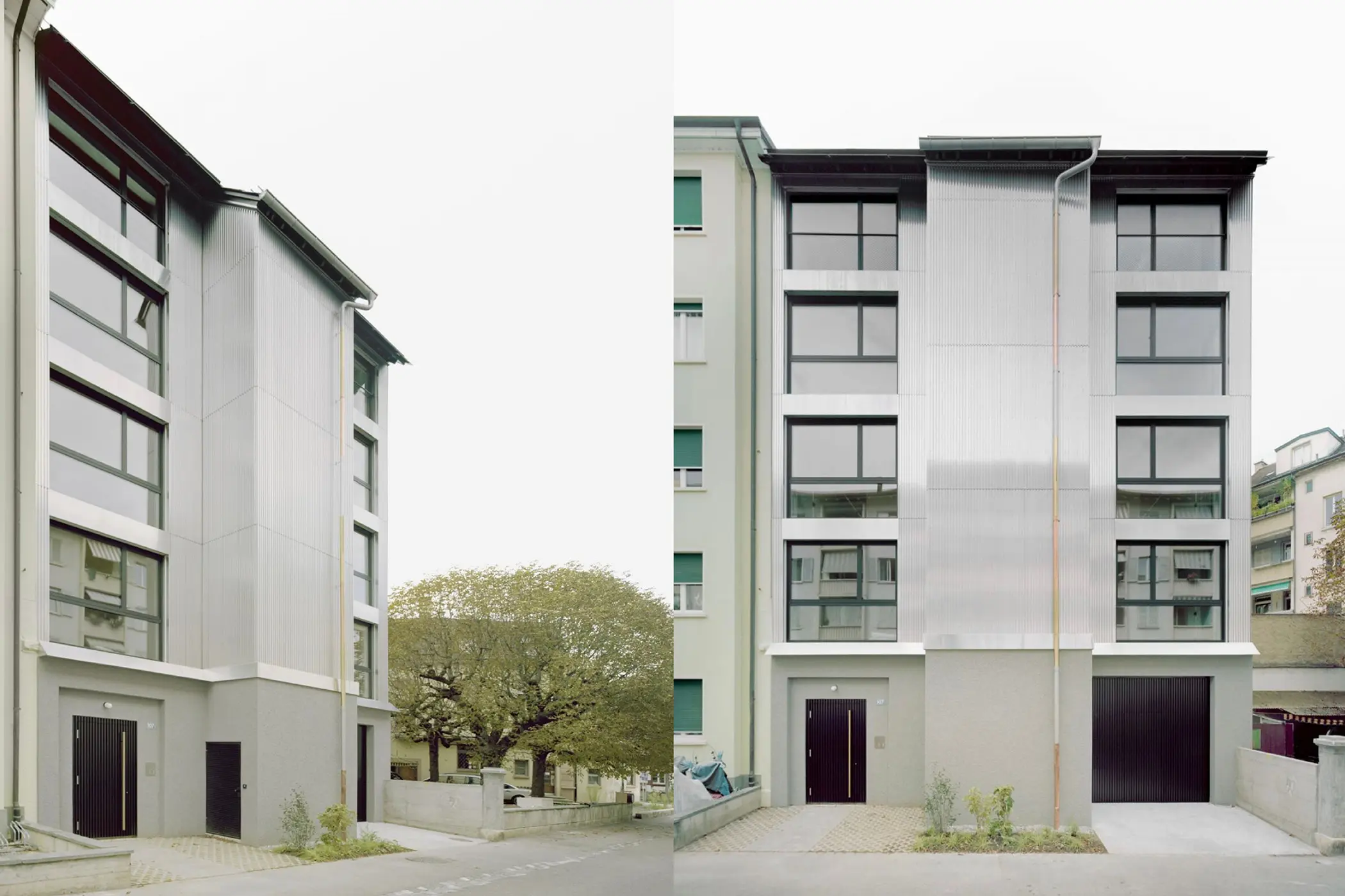 Über der bestehenden Werkstatt einer Spenglerei im Basler Matthäusquartier, stapeln sich vier neue Wohngeschosse mit acht Wohneinheiten. Das neue Gebäude ist ein vorfabrizierter Holzelementbau, der auf dem bestehenden Sockelgeschoss aufliegt. Die Aufstockung führt strassenseitig die Traufhöhe der Nachbarliegenschaft weiter und interpretiert den benachbarten Dachabschluss als Sheddach neu. Es beinhaltet durch seine Orientierung und Form zugleich die Photovoltaikanlage. Zum Hof hin, stuft sich das Gebäude aus baugesetzlichen Gründen ab, wodurch grosszügige Terrassen für die einzelnen Wohnungen geschaffen werden.