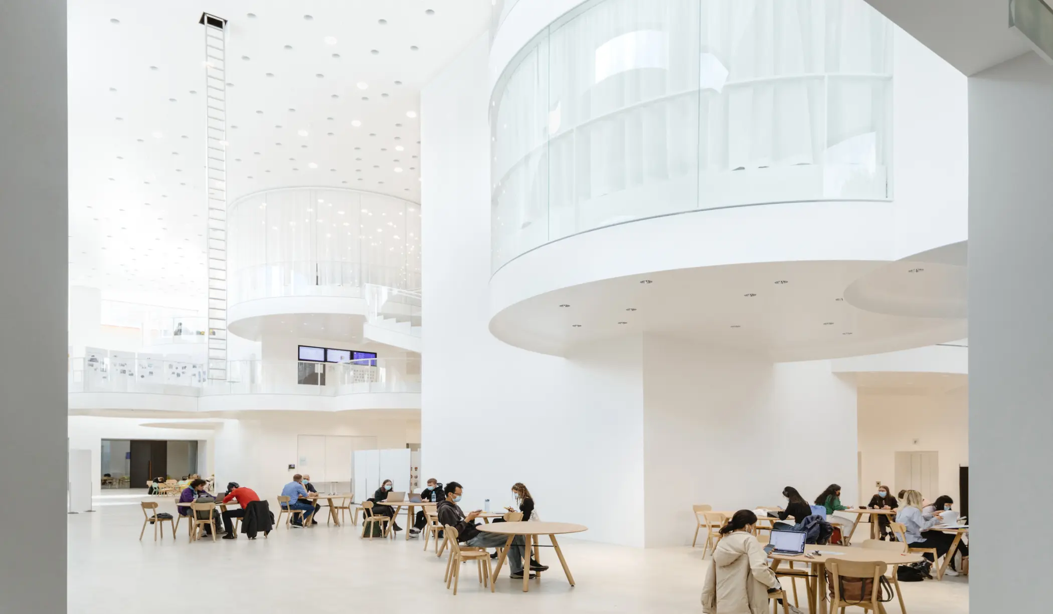 Das Herzstück ist die dreigeschossige Eingangshalle, die als öffentliches Forum mit Cafeteria konzipiert wurde. Offene Plattformen in Form von kreisförmigen Inseln werden mit Wendeltreppen miteinander verbunden.