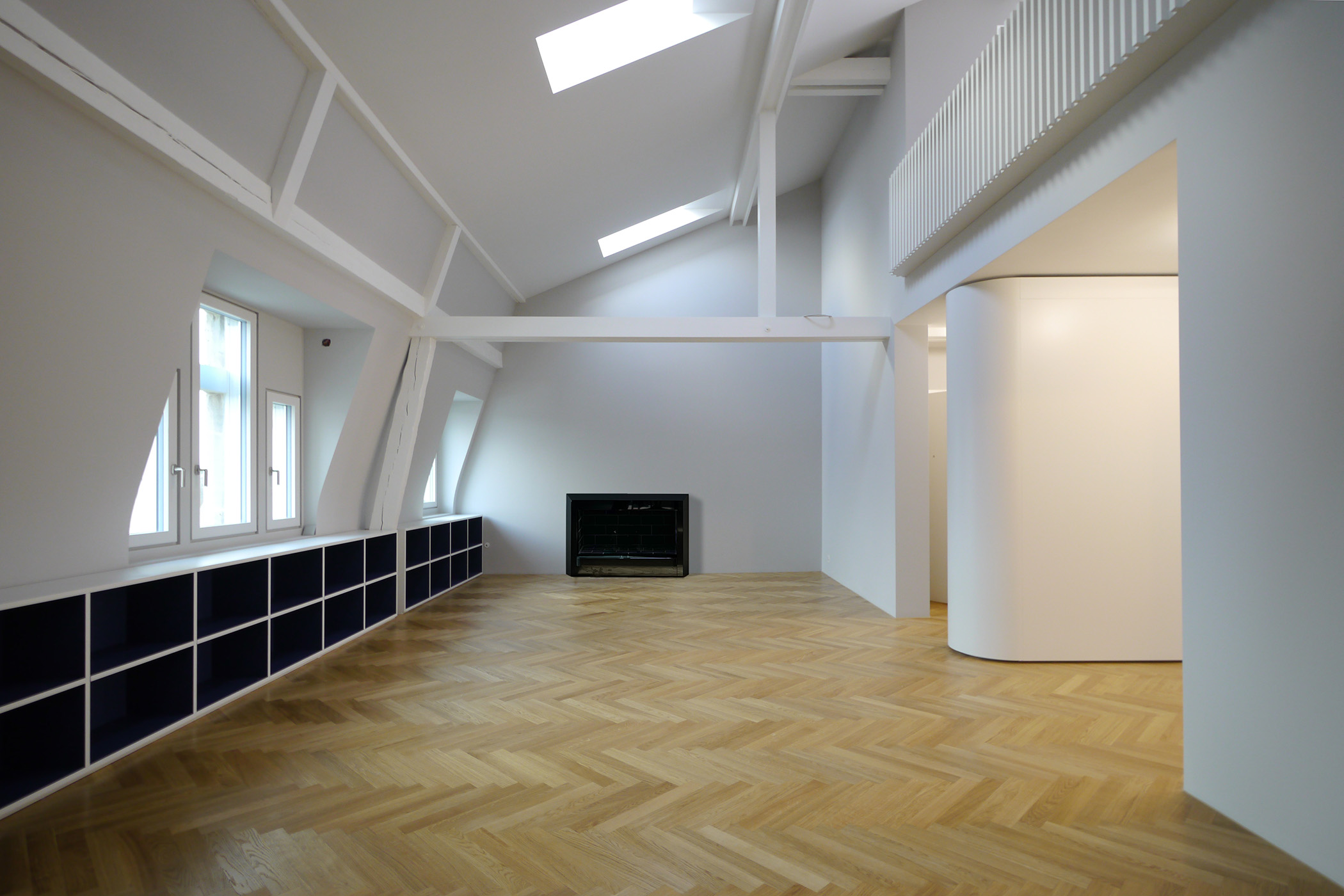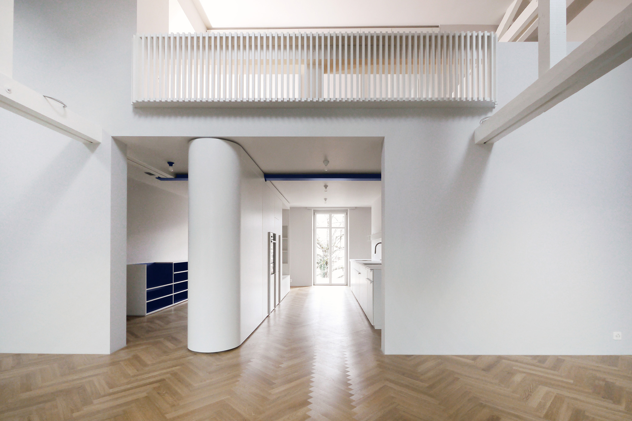 Dank der neuen Zonierung des Grundrisses – vorwiegend der Versetzung der Küche und der vormals in den Wohnbereich hineinragenden Freitreppe – erfährt der zweigeschossige Wohnbereich eine spürbare Beruhigung und neue Klarheit. Die wieder sichtbare und wiederhergestellte Dachkonstruktion in Kombination mit dem wiederverwendeten, blau hervorgehobenen Stahlträger zeigen die ursprüngliche Struktur und stärken den Altbaucharakter. Hofseitig konnte das Glasdach der bestehenden Balkonkonstruktion rückgebaut und zu einer begehbaren Terrasse umgenutzt werden, wodurch die Wohnung im Wohngeschoss über die Küche einen starken Bezug zum ruhigen Hinterhof erfährt. Präzise ausformulierte Schreinereinbauten prägen beide Geschosse, wobei ein langgezogener Schreibtisch mit vorgelagertem Staketengeländer in der Galerie den überhohen Raum inszeniert und erlebbar macht.