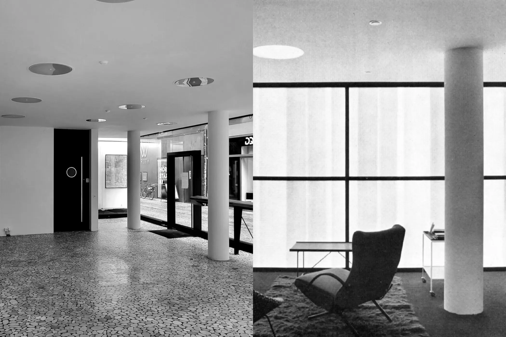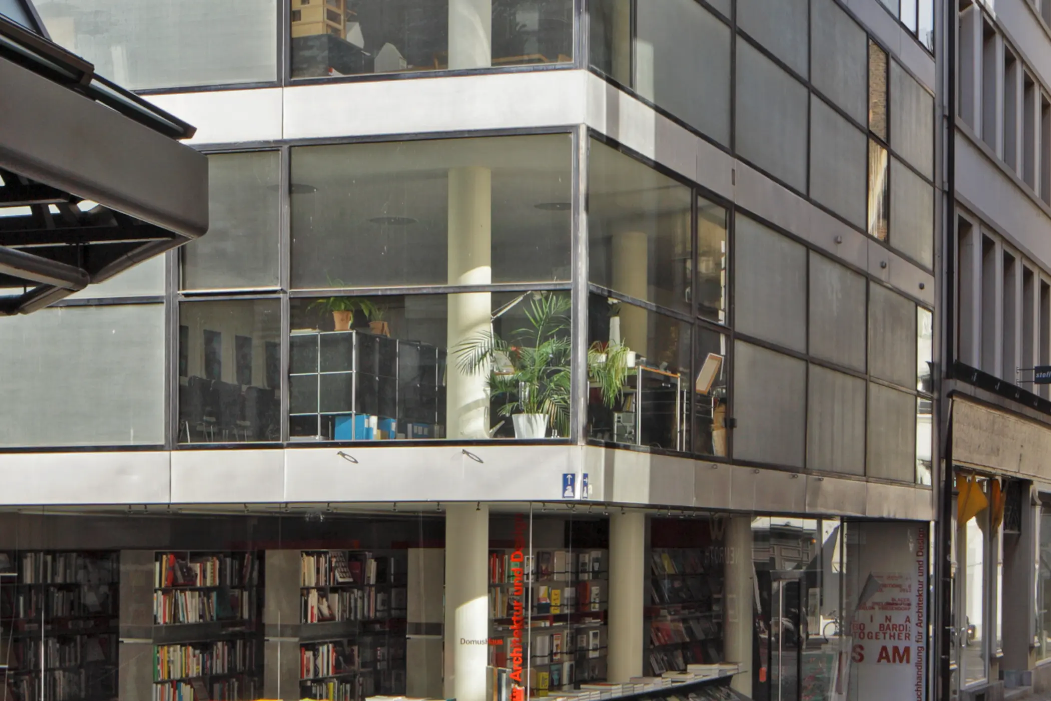 Das kubische Gebäude an der Ecke Pfluggässlein und Weisse Gasse wurde 1958/59 von Max Rasser und Tibère Vadi für das Inneneinrichtungsgeschäft «Domus» errichtet, das hier modernes Wohndesign vorwiegend skandinavischer Provenienz anbot. Es ist einer der bedeutendsten Bauten im umfangreichen Werk von Rasser & Vadi und gleichzeitig ein wichtiges Zeugnis der Schweizer Nachkriegsmoderne. 1984 wurde das Domus-Haus Sitz des Architekturmuseums in Basel (AM) und konnte so vor dem Abriss gerettet werden. Für die behutsame Renovation zeichneten Diener & Diener Architekten verantwortlich. Ab Mitte der 1980er Jahre fungierte es auch als Hotspot der aufstrebenden, jungen Basler Architekturszene. 2003 wurde das Architekturmuseum in die Kunsthalle verlegt. Seither sind vorwiegend Architekturbüros im Gebäude eingemietet. Um eine adäquate Nutzung auch für das Erdgeschoss zu finden, wurde unlängst der Verein Domushaus EG gegründet.