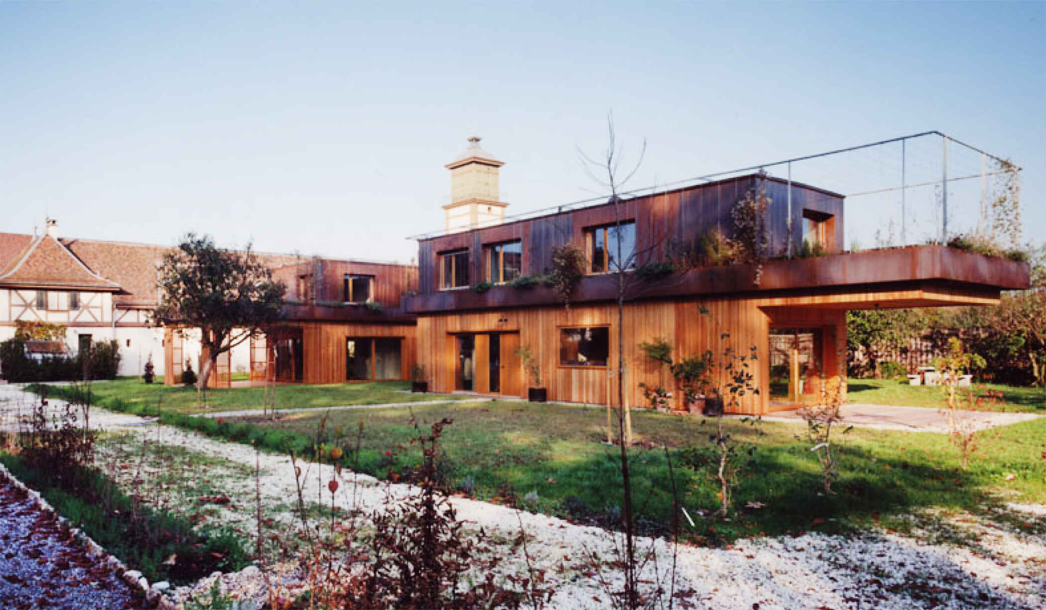 Mitten in der weiten Ebene zwischen Basel und Riehen liegt das herrschaftliche Bäumlihofareal. Das mäanderförmige Doppelwohnhaus befindet sich im ehemaligen Gemüsegarten und nimmt Bezug auf die einmalige Atmosphäre des Ortes. Während das Erdgeschoss mit einer Holzschalung verkleidet ist, verfügt das Obergeschoss über eine kupferne Gebäudehülle. Dazwischen befinden sich grosse in Kupfer verkleidete Pflanzkörper, wodurch der obere Gebäudeteil baumkronengleich begrünt wird. Dank winkelförmiger Anordnung und unterschiedlicher Orientierung verfügt jeder Hausteil über einen weitgehend vor Einblicken geschützten Aussenraum unterschiedlicher Prägung.