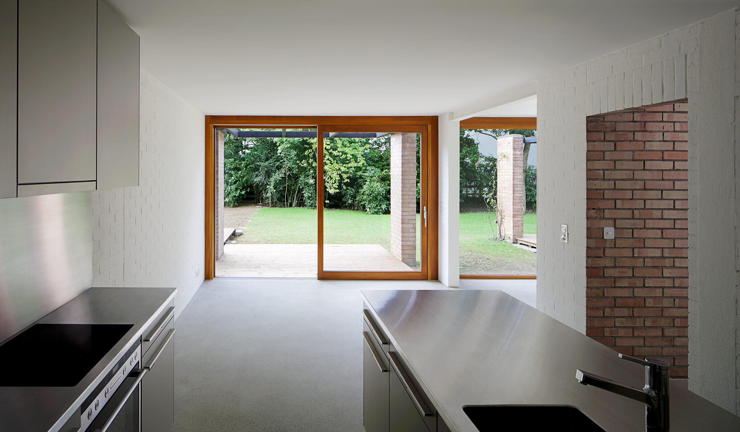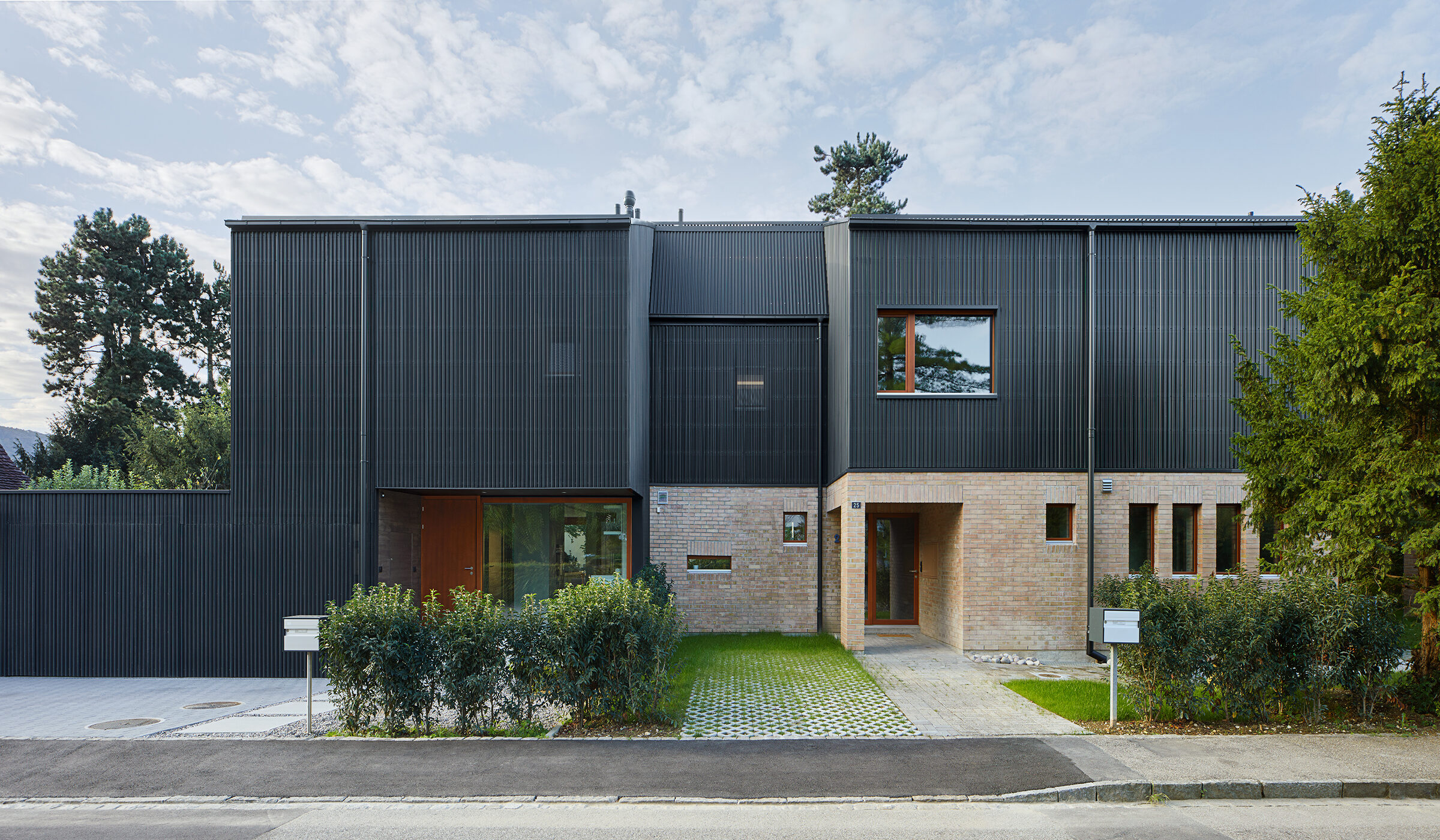 Durch die Kombination des zweischaligen Sichtmauerwerk mit dem anthrazitfarbigen Trapezblech wurde ein Zusammenspiel von alt und neu kreiert. Der Neubau wurde komplett mit Trapezblech verkleidet.