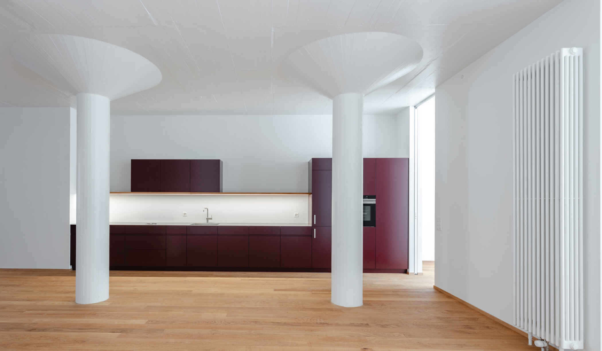 Ein bestehendes Druckereigebäude aus den 1960-er Jahre nahe der Innenstadt – bestehend aus Fabrikationshalle und Bürotrakt – wird in Wohnnutzung übergeführt. Die Direktheit der Tragkonstruktion, Pilzkopfstützen, Rippendecken und Besonderheiten wie die Stahlkonstruktion des Sheddachs werden mit wenigen neuen Elementen und Materialien ergänzt und so neun Loftwohnungen in die Bestandvolumetrie eingeschrieben. Die bestehenden Strukturen werden beibehalten, behutsam wird die neue Nutzung in den Bestand eingeführt. Es entstehen insgesamt neun horizontal entwickelte Wohnungen, welche mit Raumhöhen zwischen 3.20 bis 6.80 m in der Shedhalle eine aussergewöhnliche Raumdimension aufspannen. Die bestehende Fassade aus hinterlüfteten Aluminiumpaneelen wird beibehalten und räumlich in der Tiefe abgesetzt wird die neue Klimaschicht eingeführt.