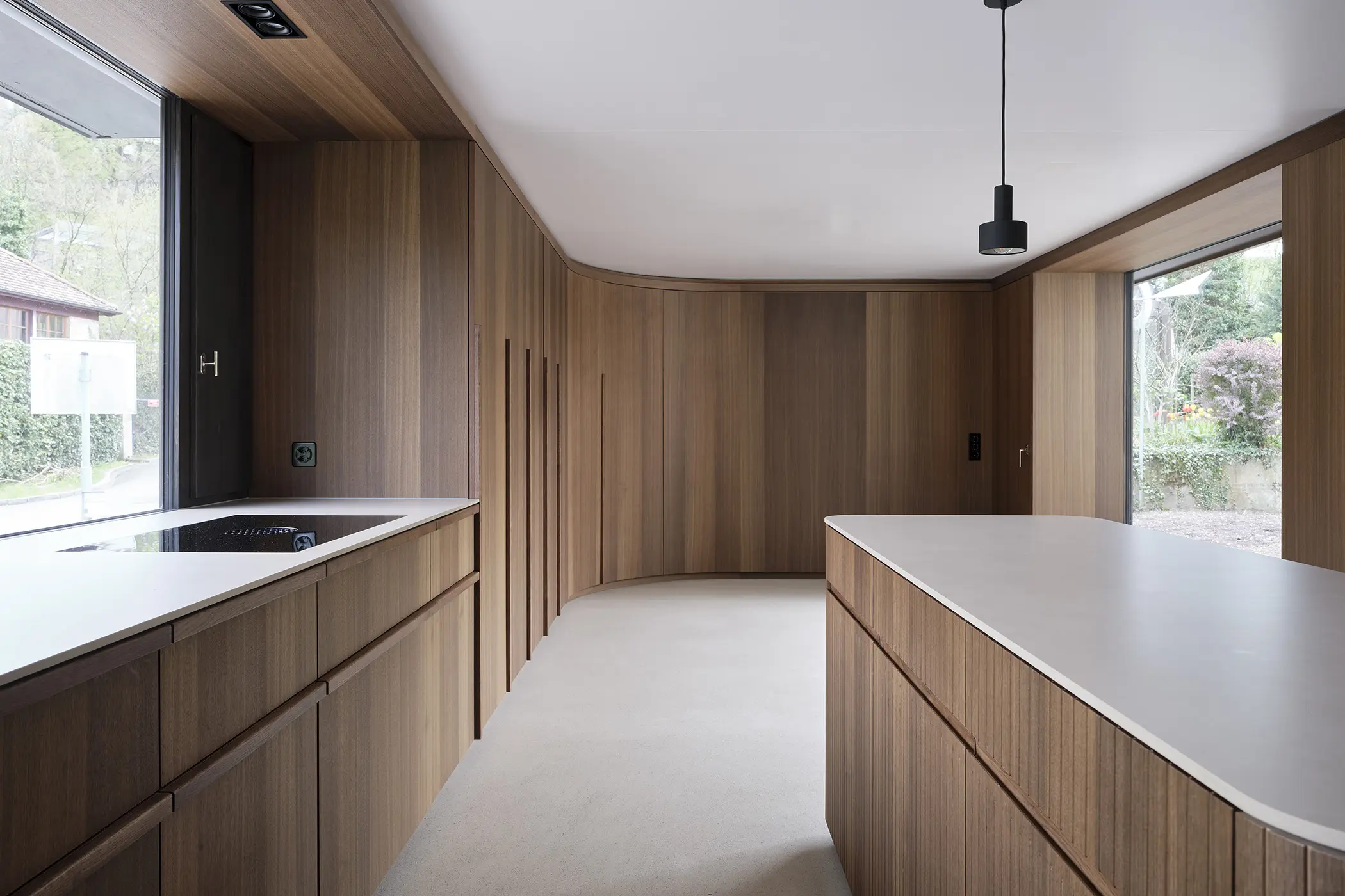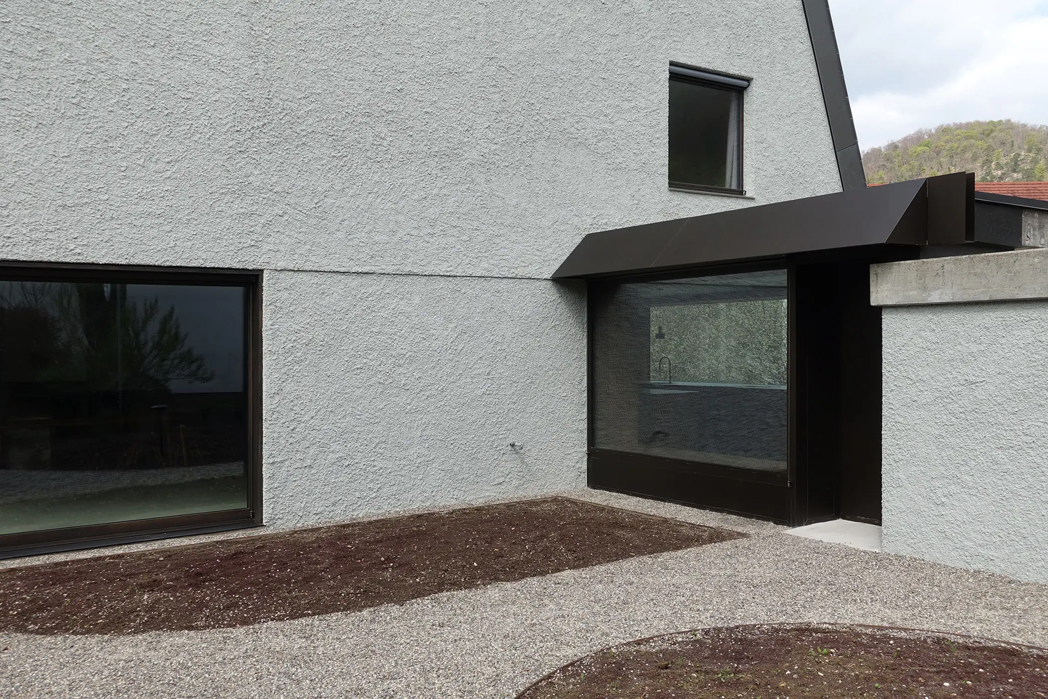 Das Haus mit Baujahr 1971, wurde grundlegend gestalterisch und energetisch saniert, wobei der Wohnbereich im Erdgeschoss durch den bestehenden Wintergarten erweitert wurde. Schreinerarbeiten aus geräucherter Eiche zonieren Eingangsbereich, Küche sowie Wohn-und Essbereich. Ein halb gerunderter Deckendurchbruch im Wohnzimmer erzeugt eine Zweigeschossigkeit und damit ein Spannungsfeld zwischen der bauzeitlich typischen, geringen Raumhöhe und dem neugeschaffenen Raumkontinuum im Erdgeschoss. Diese neue Grosszügigkeit verbindet in Kombination mit den über Eck angeordneten, teilweise zweigeschossigen Verglasungen über eine Galerie den Wohnbereich und die privaten Räume der Obergeschosse. Der neue Kellenwurf als Verputz der Fassade unterstreicht den ursprünglichen Charakter des Hauses.