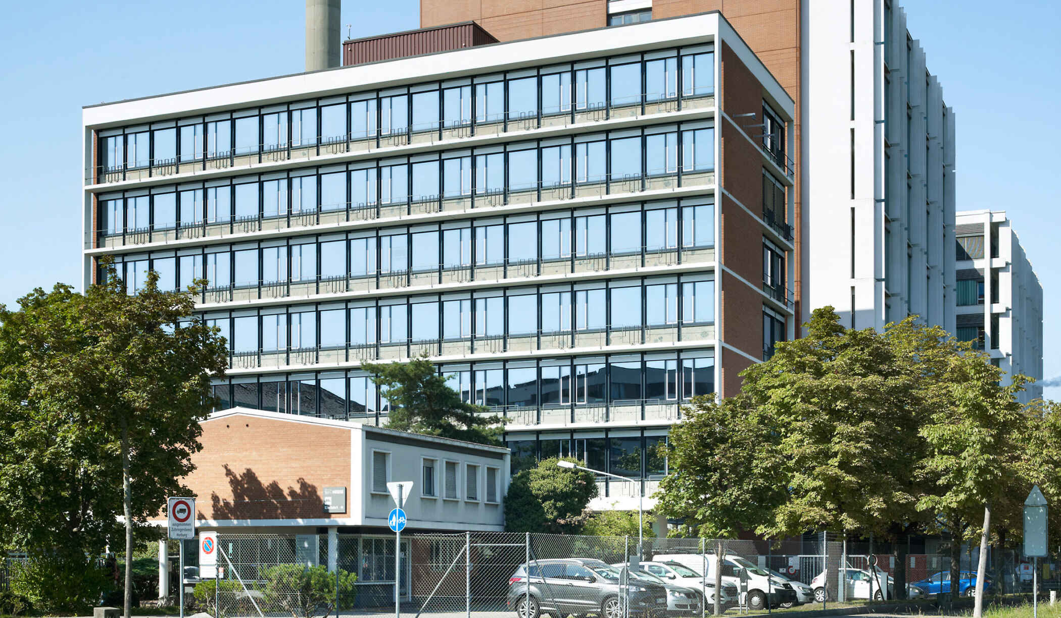 Das Verwaltungsgebäude Thomy + Franck ist ein Zeitzeuge der 1960er Jahre und verbindet die eindeutige Grundform mit einer klar gegliederten Tragstruktur. Die siebengeschossige Scheibe wird über den nördlichen Kern erschlossen und öffnet sich gegen Süden zur Stadt hin mit voll verglasten und flexibel nutzbaren Räumen. Das helle Betonraster gliedert die Fassade. Es wechselt sich ab mit dem für das Areal typischen Backstein, feingliedrigen Metallfenster und stilvollen Metallgeländern. Die mehrfache Umnutzung stellt das Potenzial dieses simplen aber eleganten Tragwerks unter Beweis.