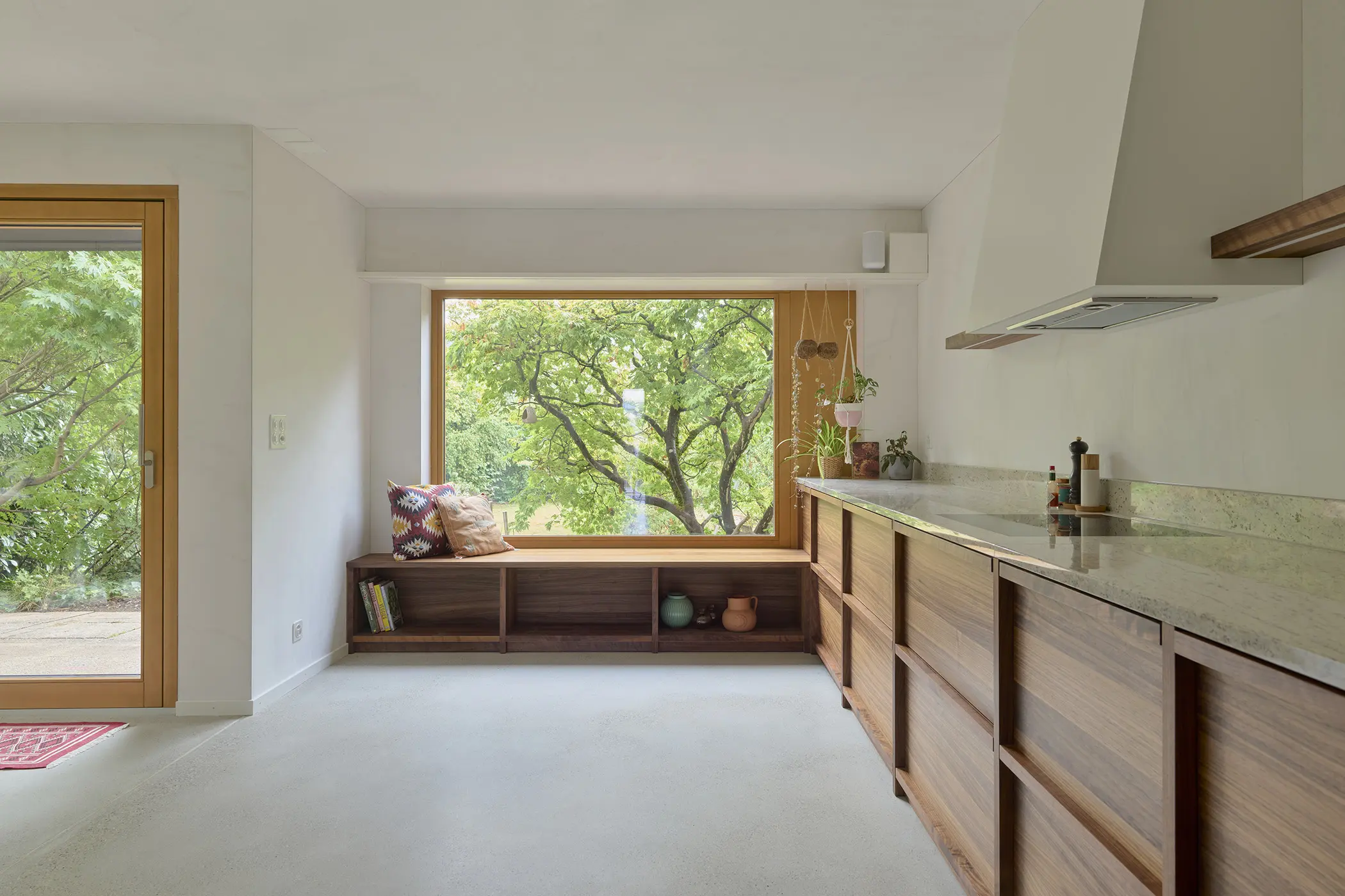 Durch das Hochparterre kommt die Terrasse auf der bestehenden, leicht erhöhten Geländeanpassung zu liegen und bietet einen wunderbaren Blick auf den Obstgarten. Im Inneren werden bestehende Elemente wie der Kamin beibehalten, während neue Einbauten, wie die moderne Küche und eine Öffnung in der Decke hinzugefügt wurden.