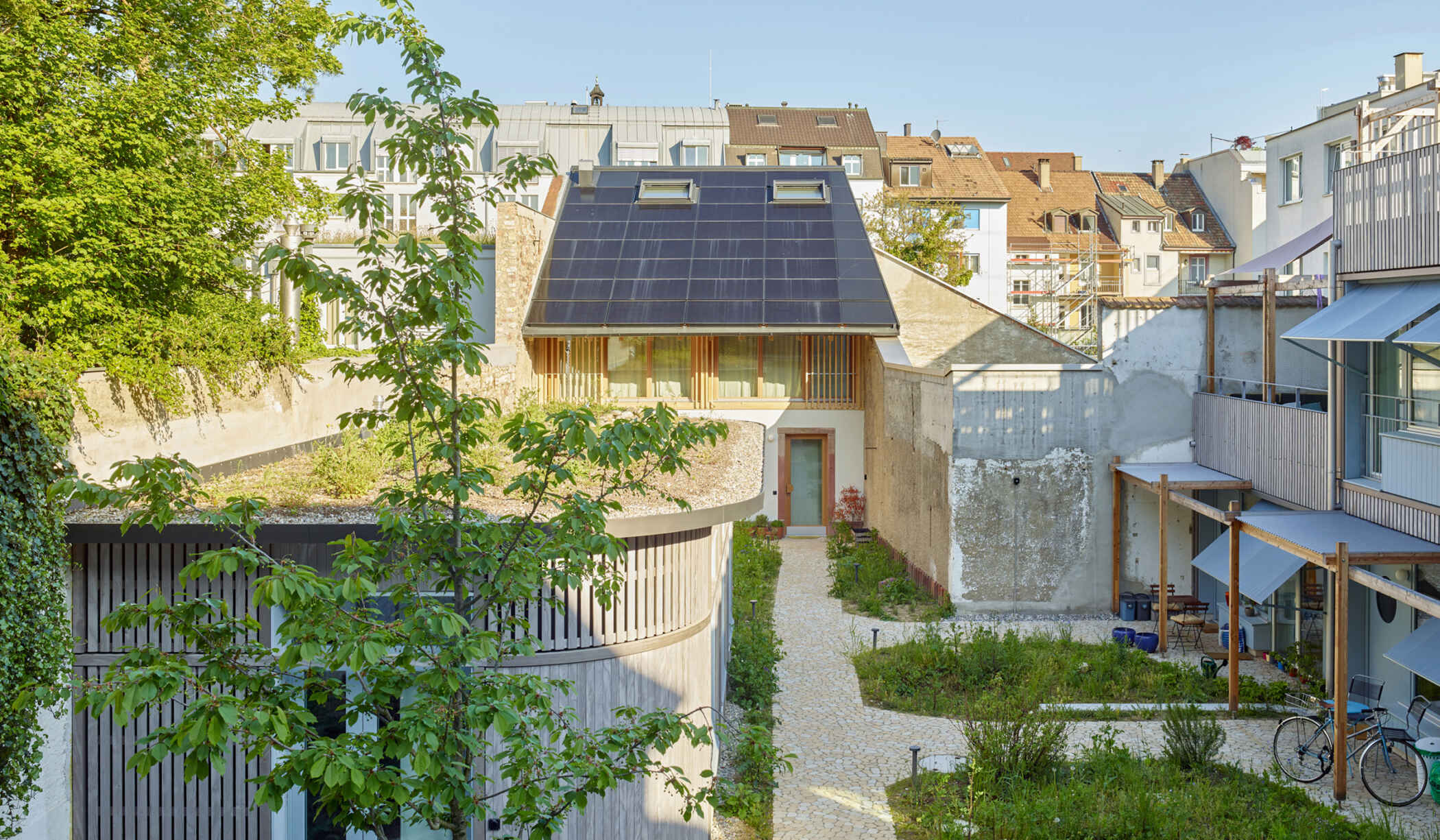 Verdichtung eines Basler Hinterhofs: Ein städtebauliches Ensemble aus Wohnungen, Kleingewerbe, Townhouses, Ateliers und Wohnpavillons in einem gemeinschaftlichen Hof. Nahe dem Burgfelderplatz entstand in einem typischen Basler Hinterhof ein dichtes städtisches Ensemble aus Wohnen, Kleingewerbe und Ateliers. Die neuen Wohn- und Arbeitsräume sind entlang der bestehenden Hofmauern angeordnet und sowohl als Umnutzungen der bestehenden Strukturen wie auch als ergänzende Neubauten konzipiert. Die räumliche und soziale Mitte des Projekts bildet der gemeinschaftliche Hof, der allen Mieter:innen gleichermassen zur Verfügung steht und als Treffpunkt dient.
