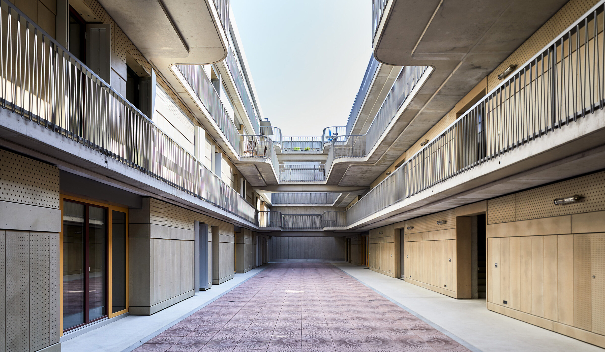 Die Wohnungen gruppieren sich in zwei Gebäudeflügeln um das gemeinsame Herz des Ensembles, den halböffentlichen Innenhof im ersten Obergeschoss. Dieser ist von einem öffentlichen Durchgang quer durch das Gebäude über eine Treppenanlage erreichbar. Ein offenes Treppenhaus, Laubengänge und Brücken über den Hof führen zu den Wohnungen. Der Hof dient neben einem grosszügigen Waschcafé als Ort der Begegnung und Kommunikation und lädt zum gemeinschaftlichen Aufenthalt ein.