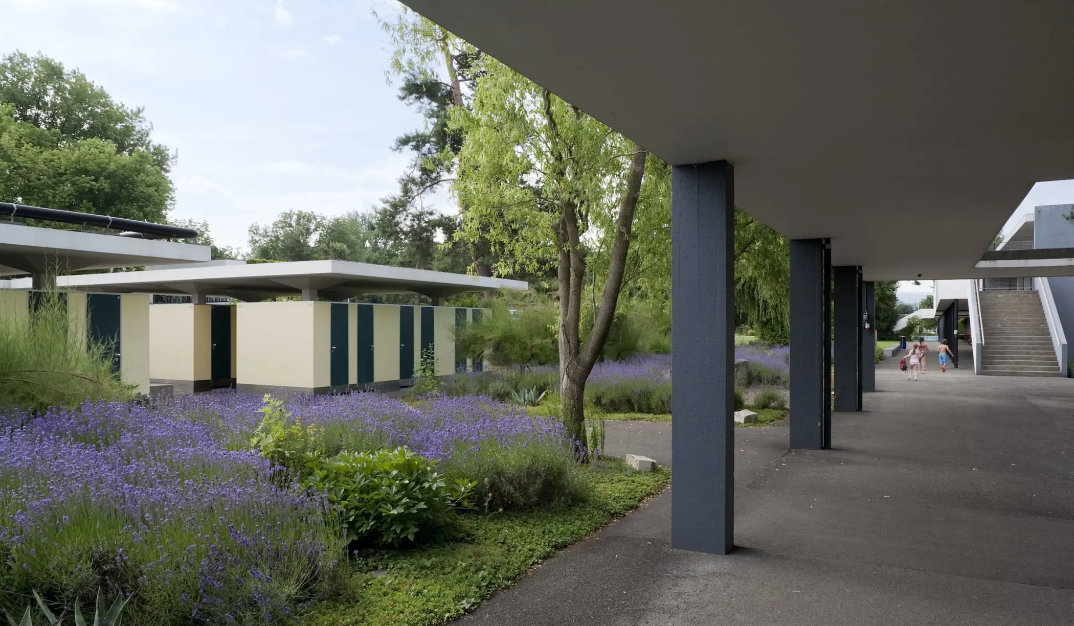 Die klare Geometrie der Kuben und Flächen, der Einsatz von wenigen Materialien und Farben, eingebettet in das fliessende Grün der Aussenanlage, machen das Gartenbad St. Jakob zu einem Gesamtkunstwerk von grosser Ausstrahlung. Zeittypische Elemente wie das lneinandergreifen von bildnerischer und grafischer Kunst sind weitgehend erhalten geblieben. Die Beschriftung der Gebäude mit sachlich konzipierten Lettern von Armin Hoffmann sind Teil der als Swiss Style international bekannt gewordene Schriftkunst.