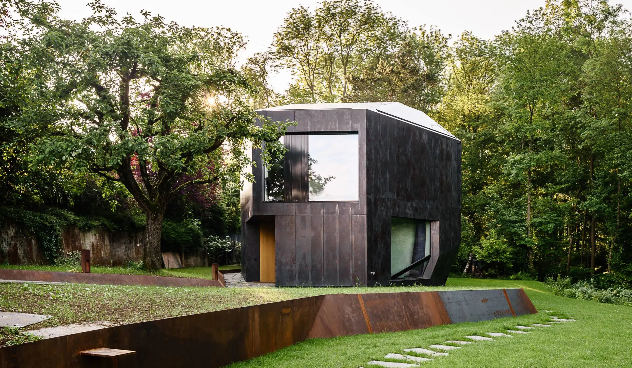 Atemberaubende Aussichten in das dichte, hohe Grün im Sommer und in die laublose lichte Aststruktur im Winter wurden zum Leitmotiv für die Architektur. Sie waren entscheidend für die Tageslichtführung und die räumlichen Bezüge im Zusammenspiel mit der Natur. So wurden die Wünsche und das Raumprogramm der naturverbundenen und kunstbegeisterten fünfköpfigen Familie in einer kompakt-kristallinen Skulptur arrangiert.