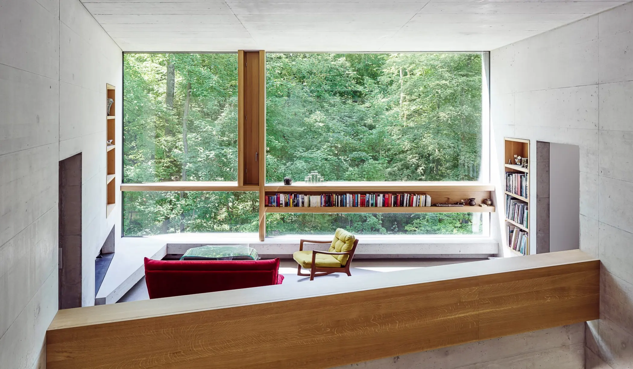 Die Differenzierung der Zimmer auf der einen und luftig offener Bereiche (Entree, Essen, Küche, Kamin, Büro, Bibliothek) auf der anderen Seite wird durch tunnelartige Treppenabfolgen und raumartige Podeste als Sequenz und Raumkontinuum erfahrbar. Der zentrale hohe Hallenraum ist zu jeder Raumsequenz hinzufügbar, verbindet visuell. Wie ein Vogelnest zwischen Ästen schwebend, zeigt sich das Wohnzimmer. Wände und Decken aus Sichtbeton sowie die schlichten Einbaumöbel in Eiche wirken elementar reduziert und konkurrenzlos zur Natur. Die erdfarbene Außenhaut und kantige Volumetrie stehen in ständigem Dialog mit der natürlichen Umgebung, suchen permanent Kontrast und Harmonie mit der Natur.