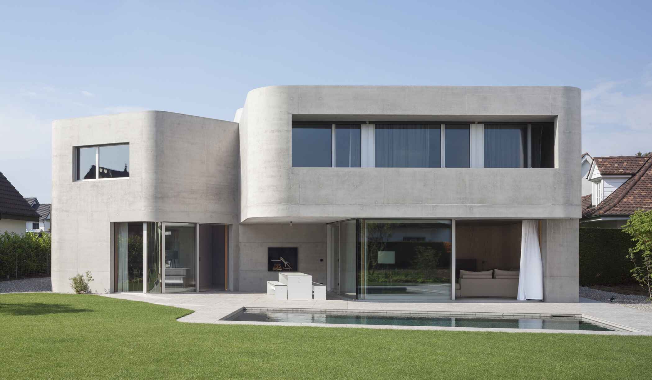 Das zweigeschossige Einfamilienhaus befindet sich auf einer Anhöhe in Binningen. Verschiedene Vor- und Rücksprünge sowie die abgerundeten und mit unterschiedlichen Radien ausgeführten Ecken verleihen dem Gebäude ein skulpturales, dynamisches Erscheinungsbild. Dieses wird durch die einheitliche Materialisierung in Beton und die differenzierte Ausformulierung verschiedener Öffnungen akzentuiert. Die Fenster an der Nord-, West- und Ostseite sind hinter der Fassade angeordnet. Auf der Südseite befinden sich grosse Öffnungen zum Garten hin. Die Rundungen setzen sich im Innern fort und erzeugen so spannende Raumabfolgen. Seekiefernsperrholzplatten, roher Stahl, Betonterrazzoboden und Sichtbetonwände sind Ausdruck einer zurückhaltenden Materialisierung des Innenraums.