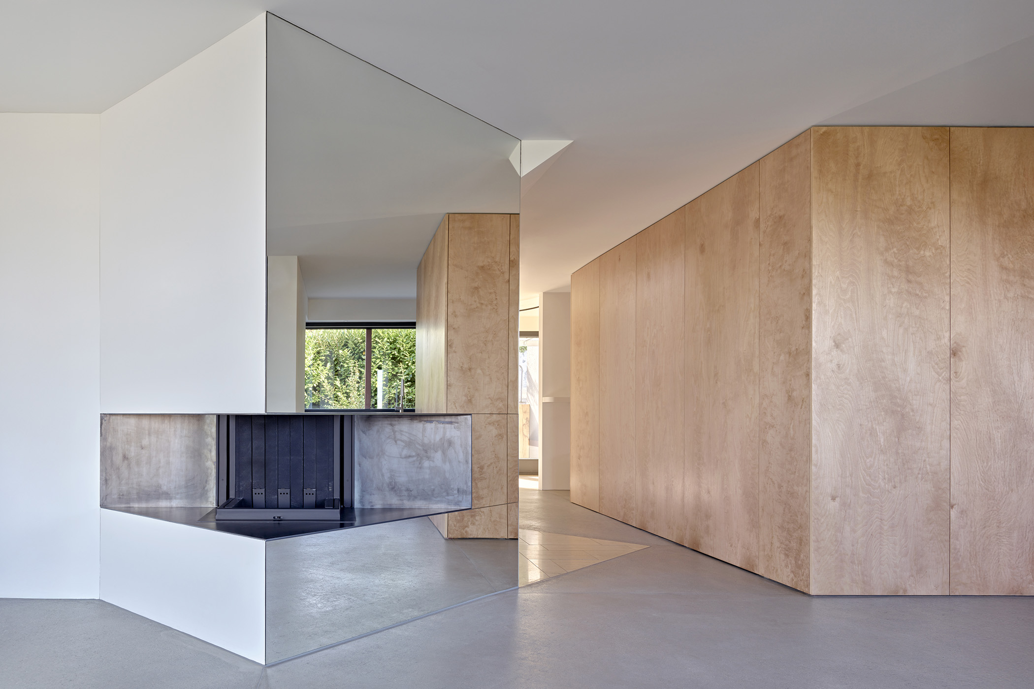 Das bestehende Einfamilienhaus besticht durch seinen gestaffelten Baukörper, der sich harmonisch in die Umgebung einfügt und differenzierte Außenräume schafft. Das Erdgeschoss wird geöffnet und großzügiger gestaltet, mit einem zentralen Kern aus Reduit und Küche sowie einem raumbildenden Kamin. Bestehende Materialien wurden, wenn möglich, weiterverwendet, was eine Collage aus Alt und Neu entstehen lässt. Geometrische Formen, teils aus Natursteinplatten, gehen einen spannungsvollen Dialog mit der neuen Grundrissdisposition ein. Die rohe Materialität der Eingriffe bleibt spürbar und verleiht den Räumen eine besondere Haptik und Atmosphäre.