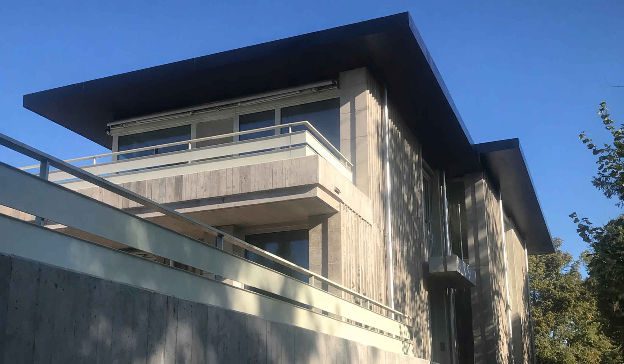 Die geschlossenen Teile der Aussenhülle sind gegossen und mit vertikalen Schalungseinlagen stark strukturiert. Grosszügige Verglasungen und Balkone auf der Gartenseite differenzieren die Fassade zusätzlich und schaffen offene wie auch gedeckte Aussenräume.