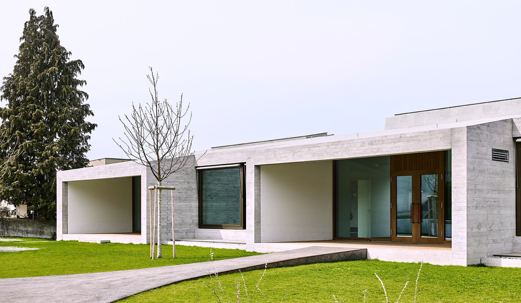 Das zweigeschossige Volumen wird so in die Hämisgärten gesetzt, dass die beiden übereinanderliegenden Nutzungen sowohl talseitig als auch hangseitig ebenerdig erschlossen werden. Das Gebäude ist in Massivbauweise mit Schottenstruktur ausgeführt. In Anlehnung zum bestehenden Talholzschulhaus werden die Aussenwände in brettgeschaltem Sichtbeton erstellt. Eine markante Silhouette prägt den Baukörper und schafft im Innern unterschiedliche Raumqualitäten. Im Rhythmus der Schottenstruktur wird das Gebäude mit Nischen auf der Tal- und Hangseite moduliert . Die Dachlandschaft wird durch drei Oberlichter gegliedert. Diese liegen abwechselnd dies- oder jenseits des Firstes und sorgen für eine angenehme Lichtstimmung im Eingangsbereich und den beiden Haupträumen der Kindergärten.