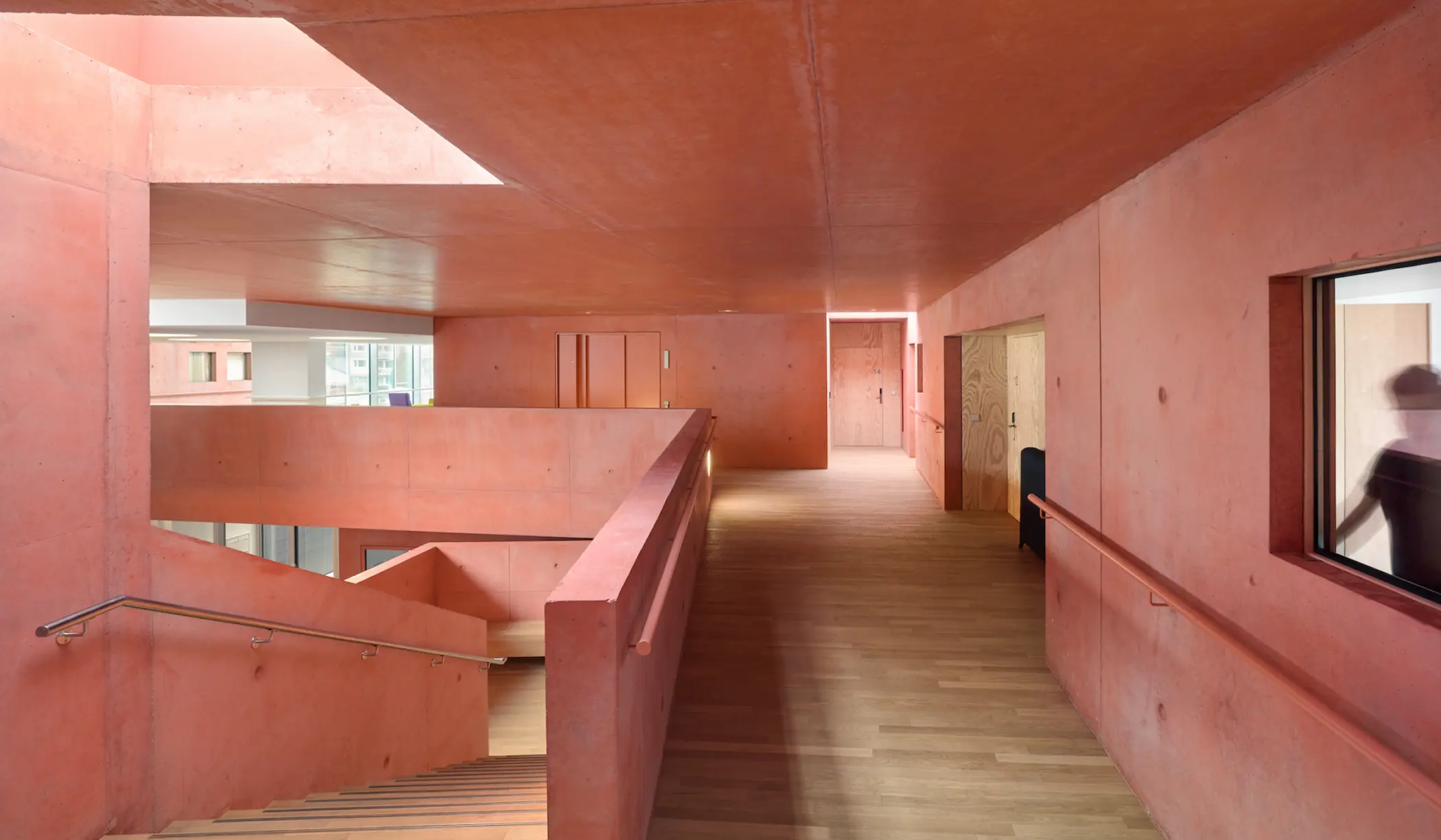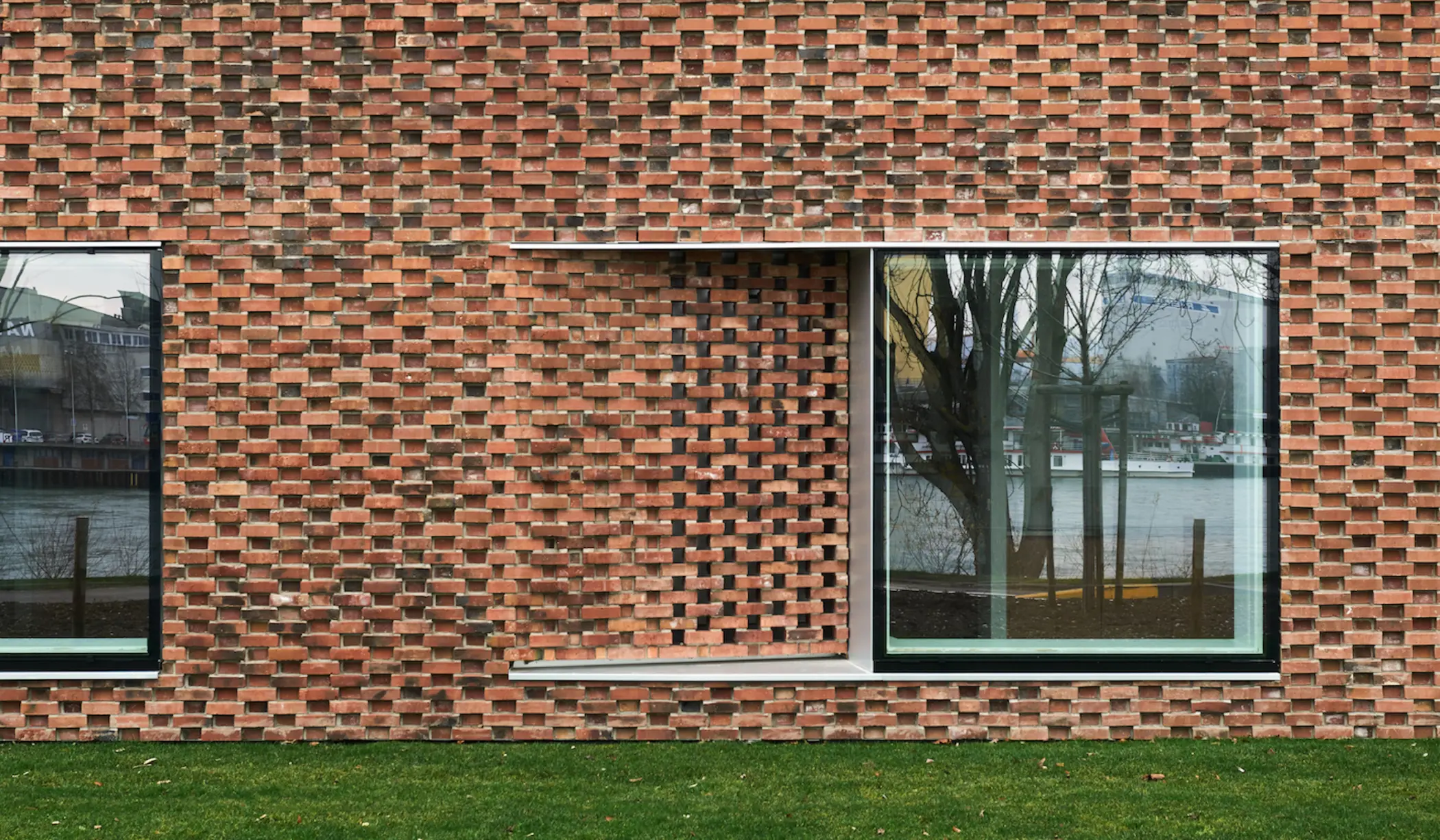 Le béton rouge, la terre cuite et le bois fabriquent une atmosphère bienveillante. À l’extérieur, la brique enveloppe le bâtiment sur toutes ses faces. Nous avons sélectionné une brique artisanale déclassée, une brique irrégulière et parfois déformée. Les parois accrochent bien la lumière, le bâtiment revendique une rusticité portuaire. Il se rattache à l’histoire Rhénane.
