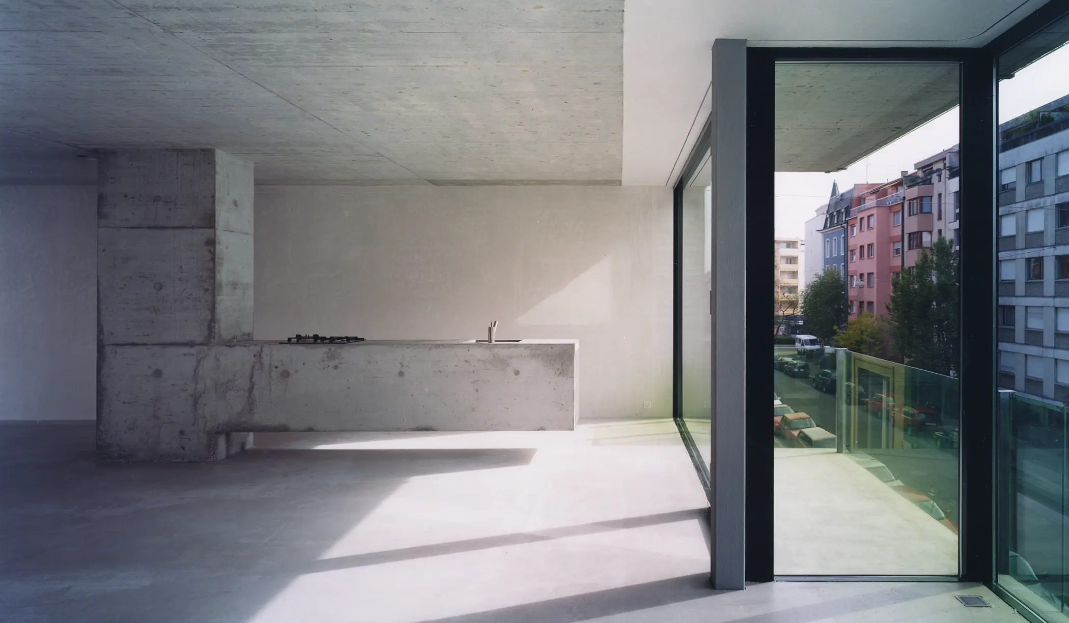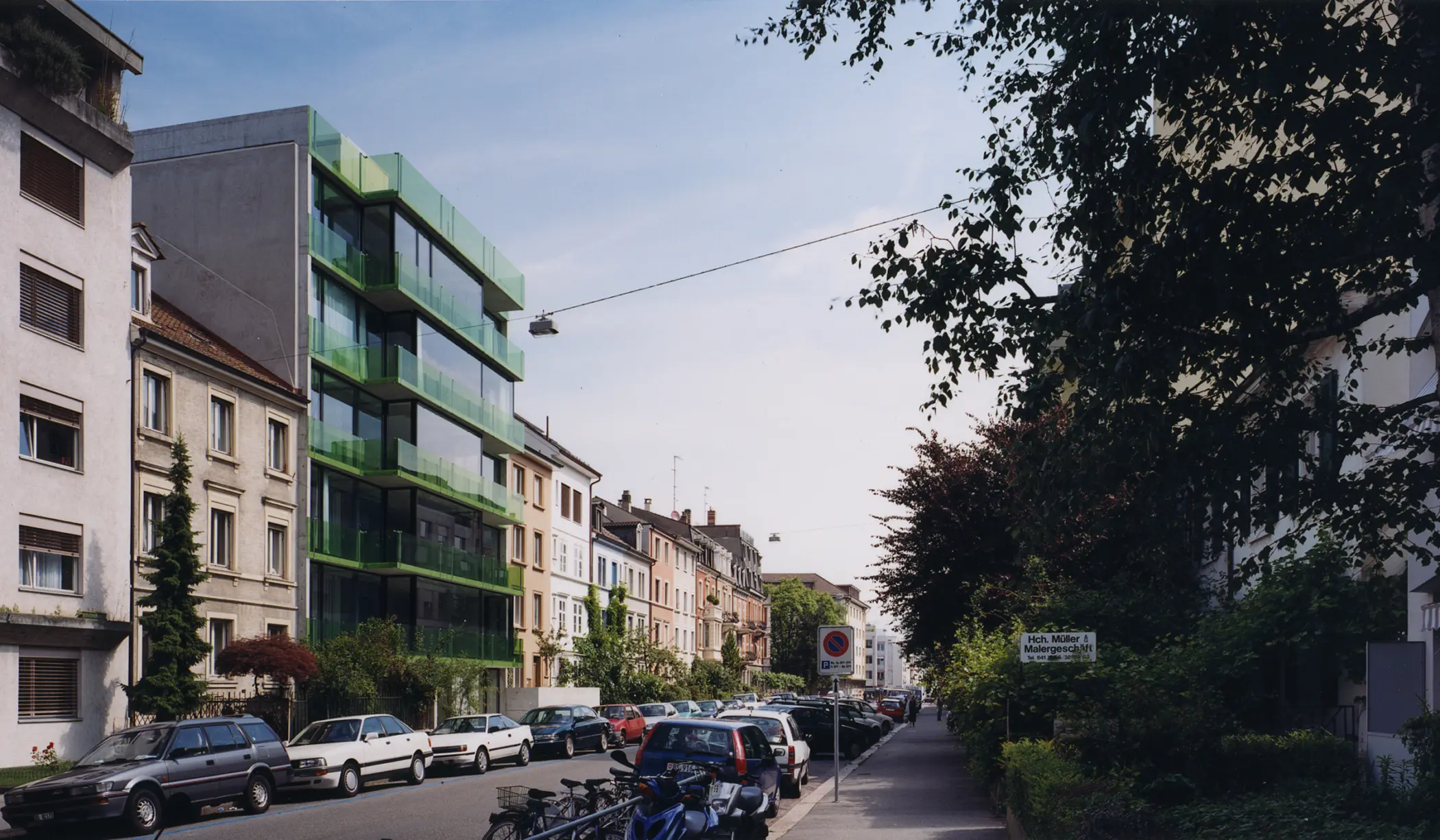 Sechs Plattformen werden in die neue Lücke im Blockrand eingespannt. So entsteht ein offenes sechsgeschossiges Wohnregal zwischen Garten und Stadt. Die Plattformen sind durch zwei Erschliessungskerne durchbrochen. Der eine Kern beinhaltet Treppenhaus, Bad sowie den Lift, der direkt in die Wohnungen führt. Der zweite Kern ist ein Erschliessungsschacht für die Küchen. Um die Kerne verläuft der Grossraum mit zwei verschieden grossen Bereichen. Die Fassade ist vollständig verglast, grüne Glasgeländer erzeugen eine feine Farbstimmung im Innern. Die individuelle Ausformulierung der Wohnungen spiegelt sich in der geschossweise erfolgenden Verschiebung der Fassadenform wider.