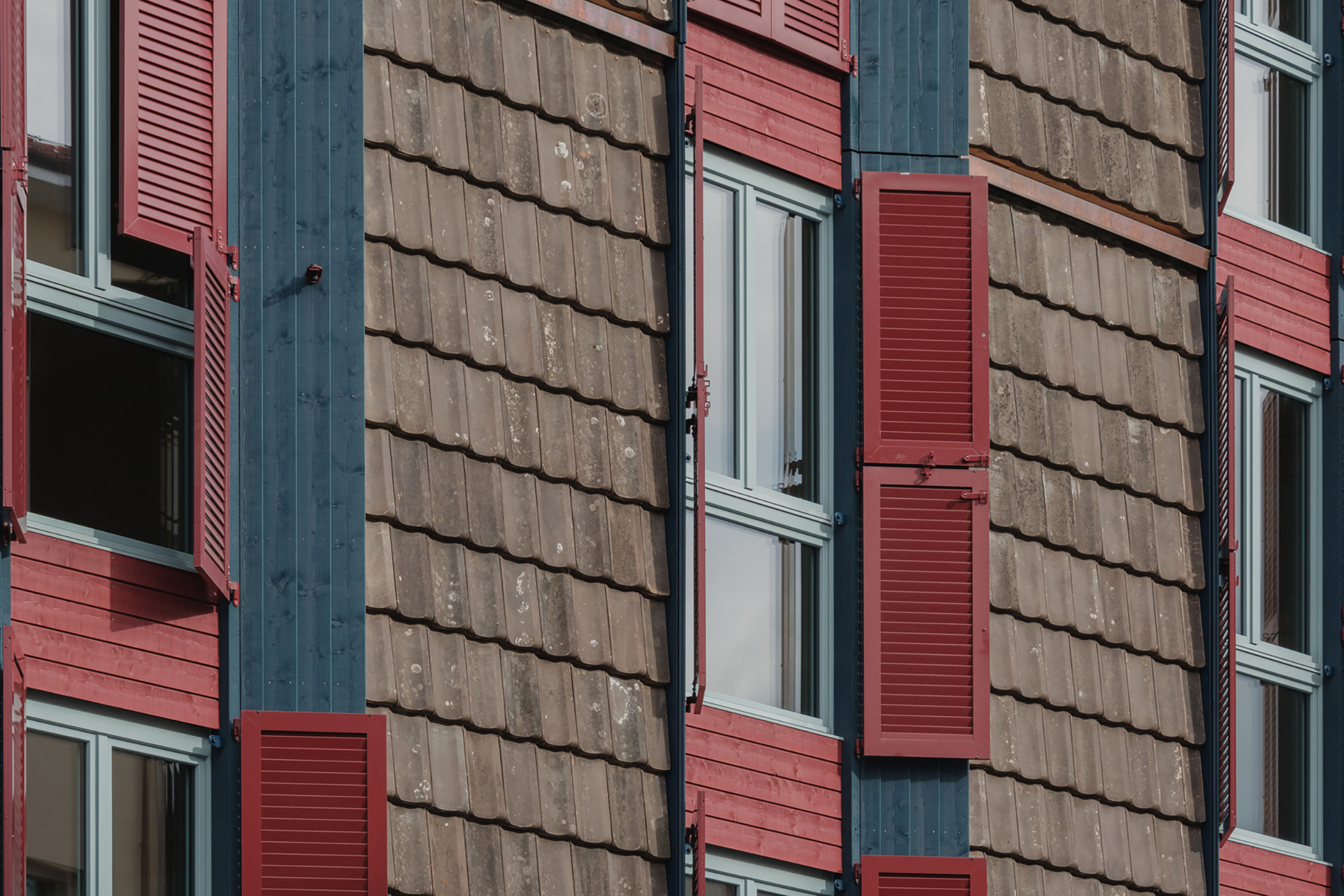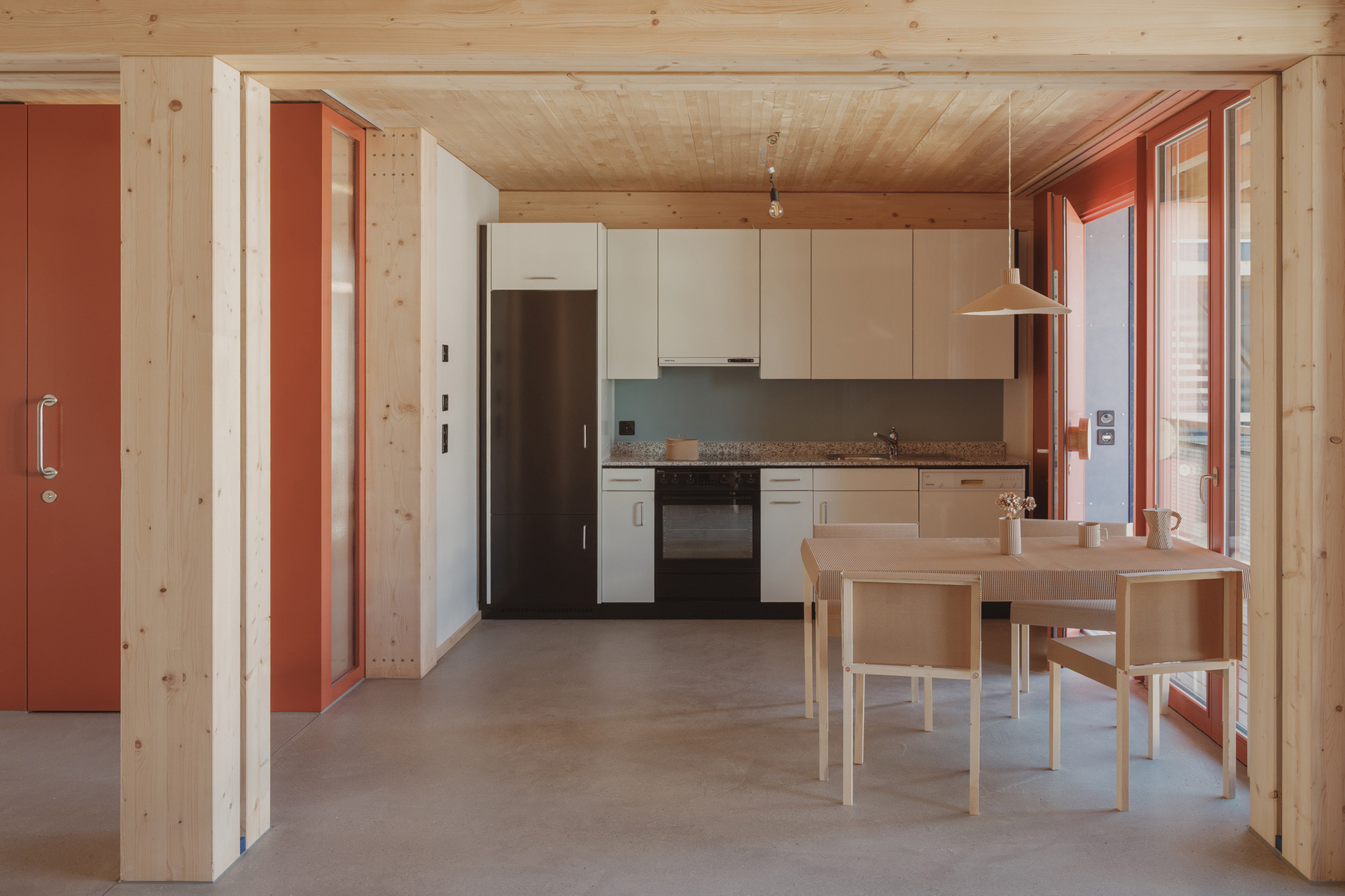 Die 27 kostengünstigen, zweiseitig orientierten Wohnungen sind flexibel nutzbar: Wohnen zum Hof, Schlafen zur Strasse. Kompakte Grundrisse minimieren die Fläche pro Person. Gebaut als Holzbau, folgen die verbauten Materialien dem Prinzip «Design to Disassembly». Rund 30 Re-Use-Bauteile fanden in unterschiedlichen Konstruktionen ein zweites Leben und sparen etwa 100 Tonnen CO? ein.
