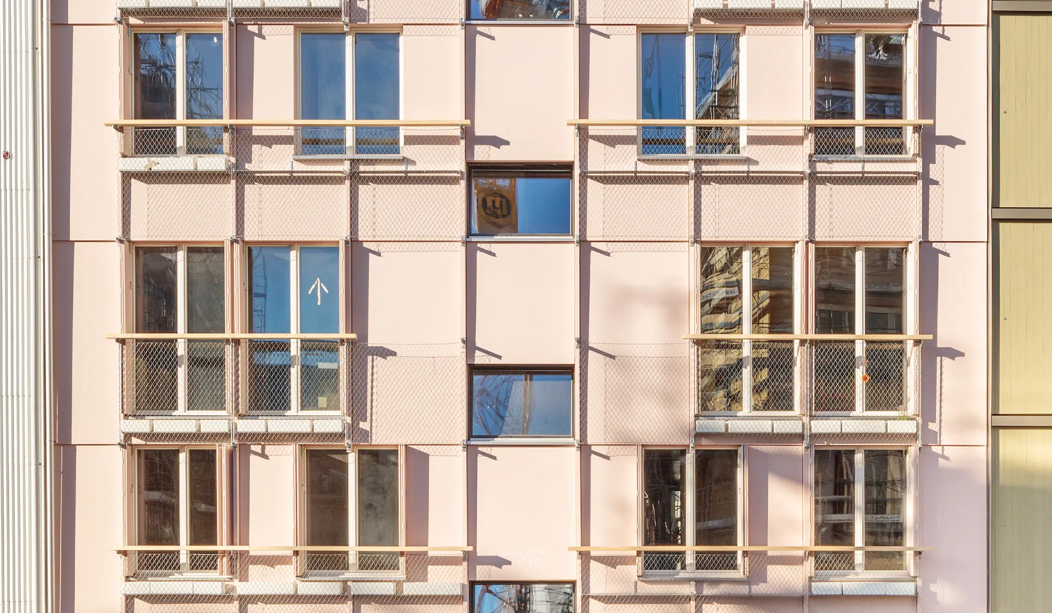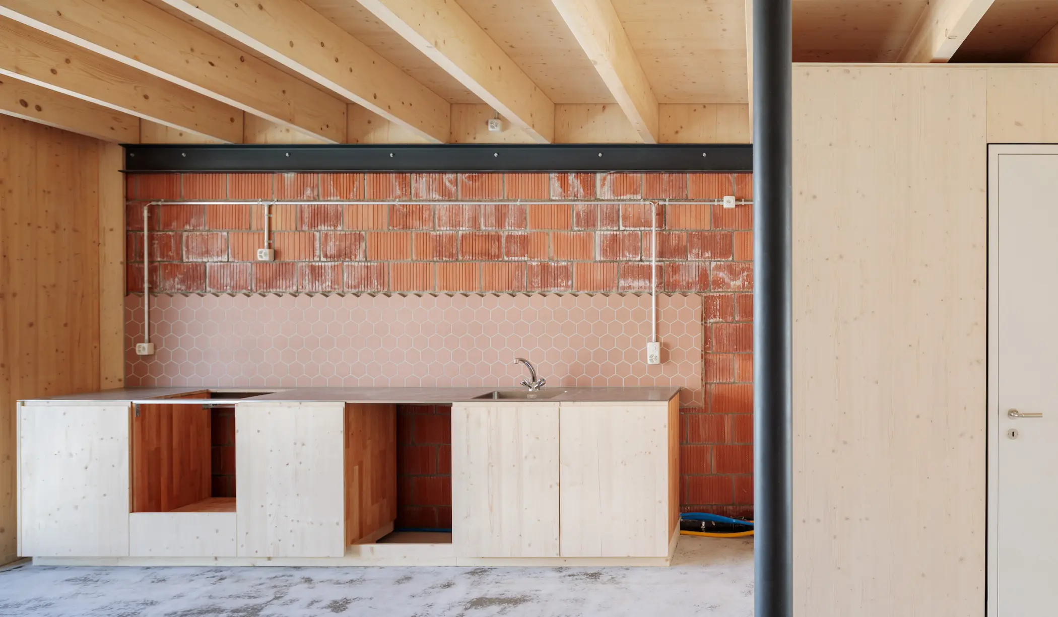 Das Stadtkind Haus ist ein Hybrid, in dem die Baustoffe ihren Talenten entsprechend zum Einsatz kommen. Das Ziel, kostengünstigen Wohnraum in der Stadt mit ressourcenschonendem, achtsamem Bauen zu vermählen. Im August 2023 sind ein Dutzend Kinder und ihre Eltern in das rosarote Haus am Beckenweg 9 gezogen.