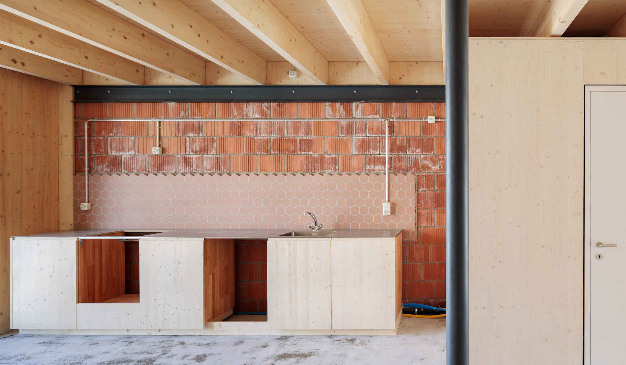 Das Stadtkind Haus ist ein Hybrid, in dem die Baustoffe ihren Talenten entsprechend zum Einsatz kommen. Das Ziel, kostengünstigen Wohnraum in der Stadt mit ressourcenschonendem, achtsamem Bauen zu vermählen. Im August 2023 sind ein Dutzend Kinder und ihre Eltern in das rosarote Haus am Beckenweg 9 gezogen.