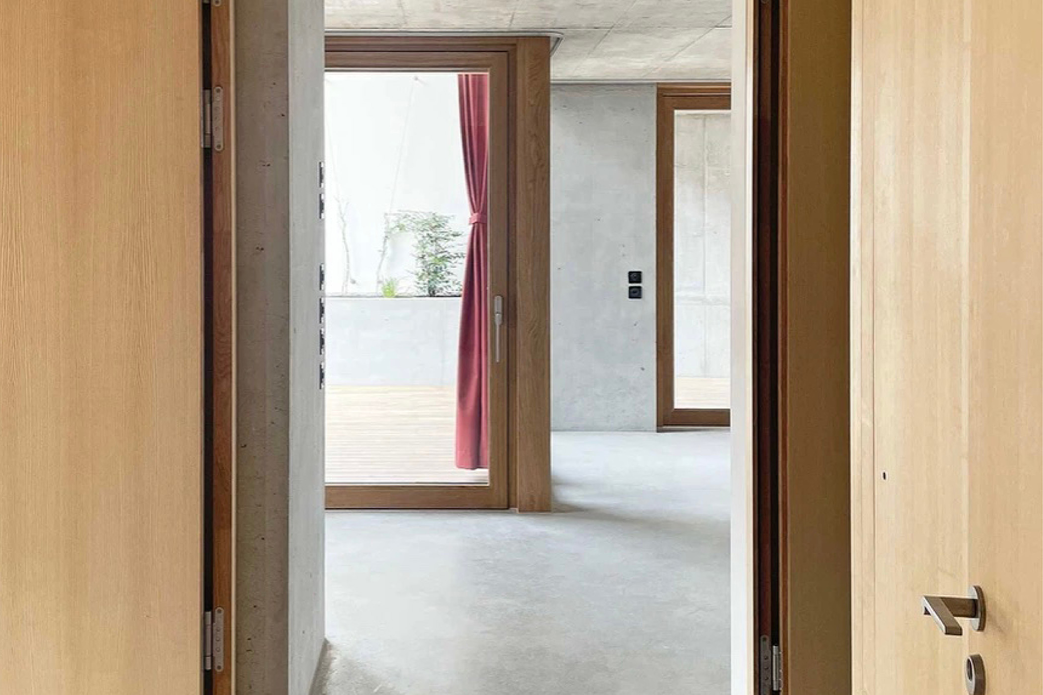 Die Konstruktion folgt einem Low-Tech Ansatz. Es kommen möglichst einfache und unbehandelte Materialien zum Einsatz, sichtbare Oberflächen sind mehrheitlich die effektiven Konstruktionsmaterialien. Die massiven Aussenwände aus Einsteinmauerwerk werden geschlämmt wodurch das Fugenbild plastisch in Erscheinung tritt. Die Keramik im Sockelbereich nimmt das Thema des Sichtmauerwerks auf und schafft einen Bezug zum Vorgänger- und den Nachbarbauten im Quartier.