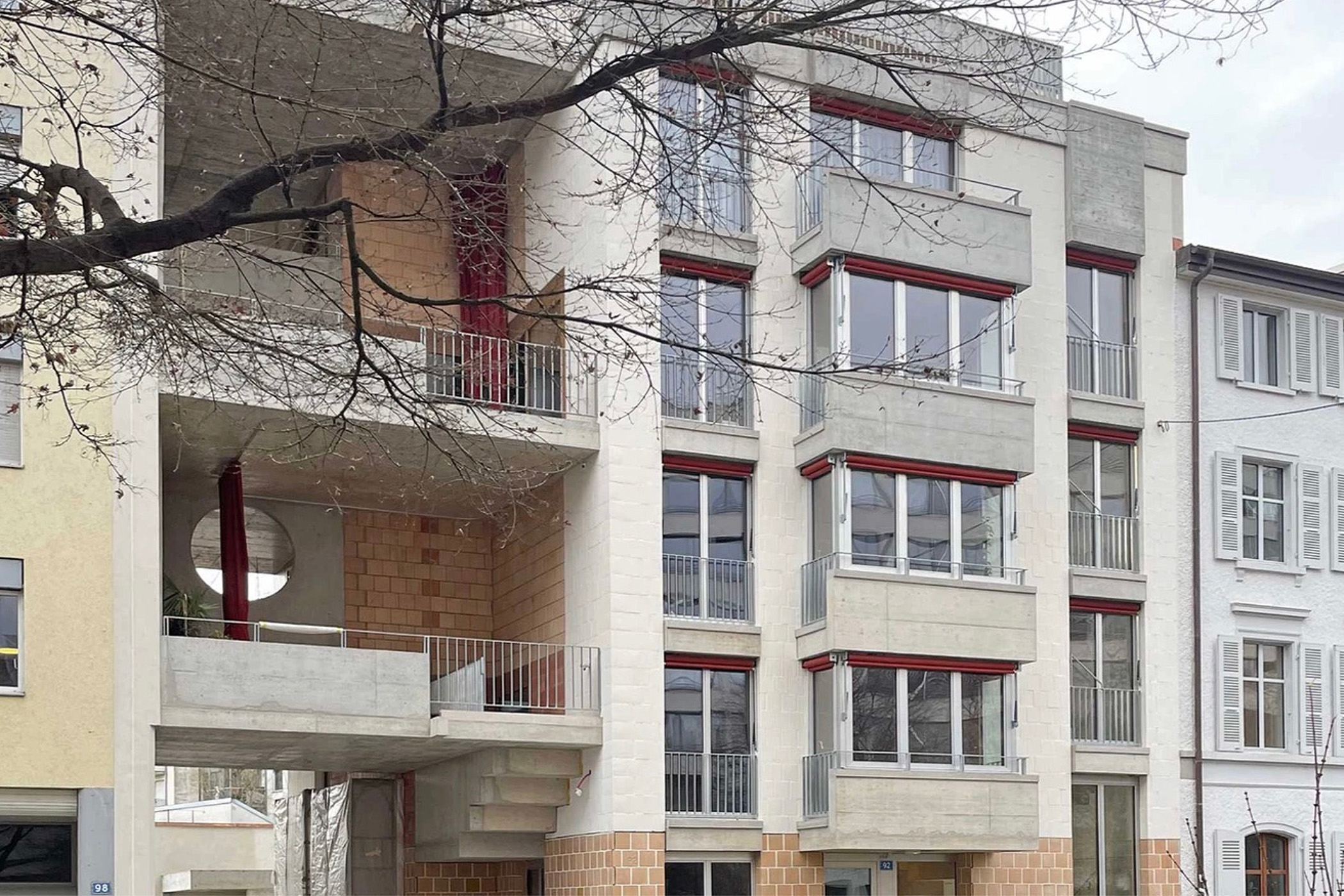 Der Neubau an der Hammerstrasse erstreckt sich über die angrenzende Hofzufahrt wodurch der Blockrand geschlossen und der Strassenraum gefasst wird. Auf 5 Geschossen und einem Attikageschoss befinden sich 7 Mietwohnungen. Grosszügige Balkone über der Hofzufahrt bilden veritable Stadtgärten mit versetzten, überhohen Räumen.