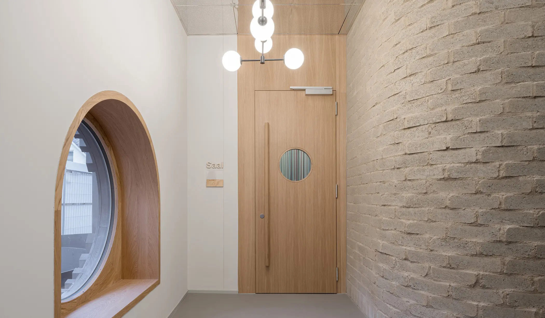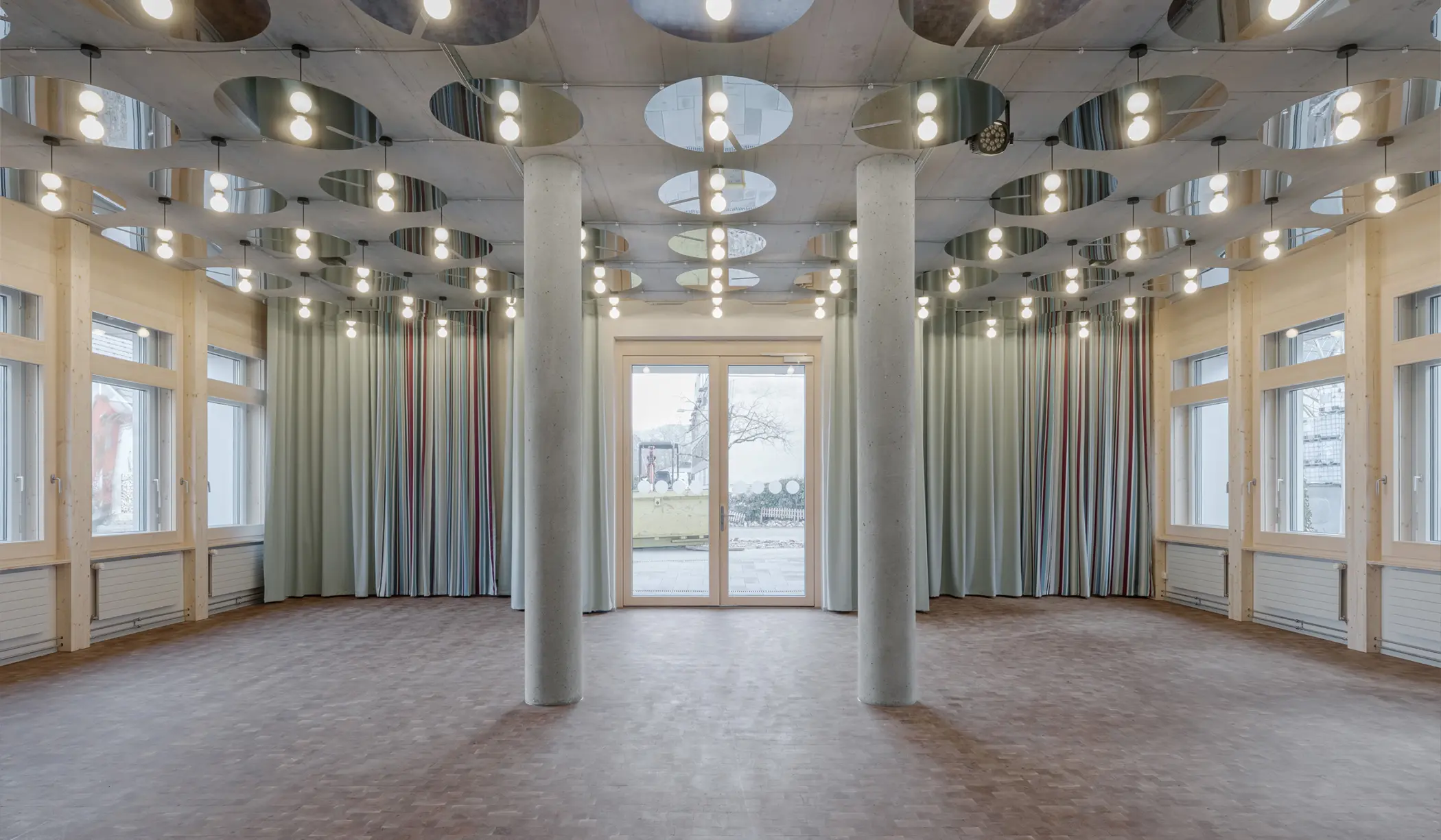 In Reinach bei Basel hat Burckhardt einen ehemaligen Bürobau in eine Musikschule transformiert. Das Projekt ist Teil der Wohnüberbauung Hinterkirch, einer Eigenentwicklung von Burckhardt. Umbau und Sanierung folgten dem Leitsatz des minimalen Rückbaus bei maximalem Einsatz regenerativer, recycelter und vorhandener Materialien und Bauteile. Entsprechend wurden die bestehenden Strukturen so weit wie möglich weiterverwendet und durch kleine, passgenaue Massnahmen an die neuen räumlichen Bedürfnisse angepasst. Wo neue Materialien zum Einsatz kamen, sind diese weitgehend regenerativ, wie Holz, Flachs und Lehm. Sie sind entweder recycelt oder aus dem Bestand in neuer Form wiederverwendet. Gestalterisch am prominentesten tritt die Lehmsteinwand im grossen Saal als Herzstück des Gebäudes im Erdgeschoss hervor. Sie greift das bereits im Grundriss vorhandene Motiv der gerundeten Wand auf und artikuliert eine gefasste Bühnenfläche.