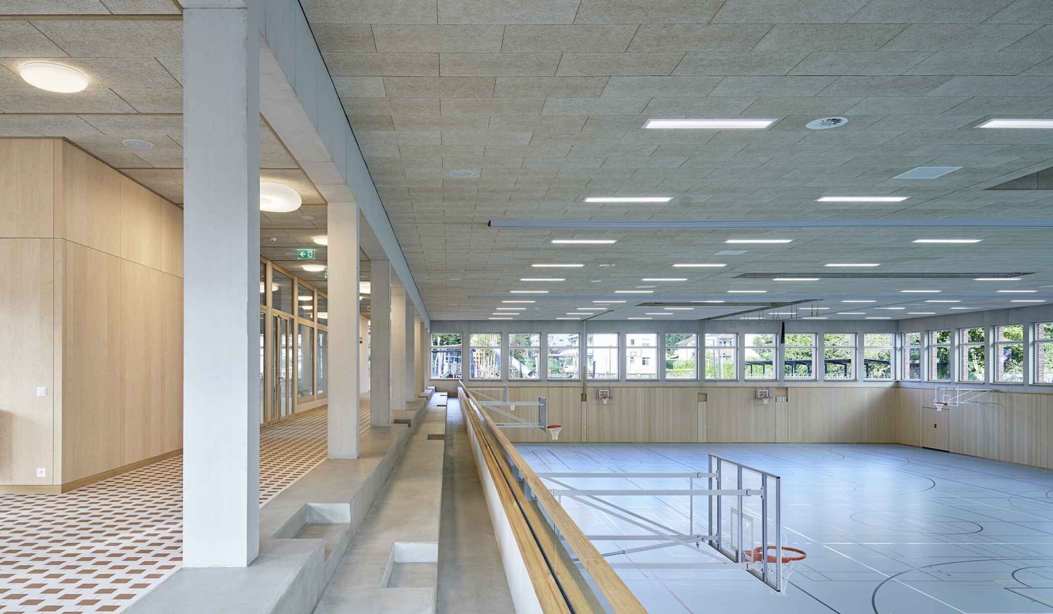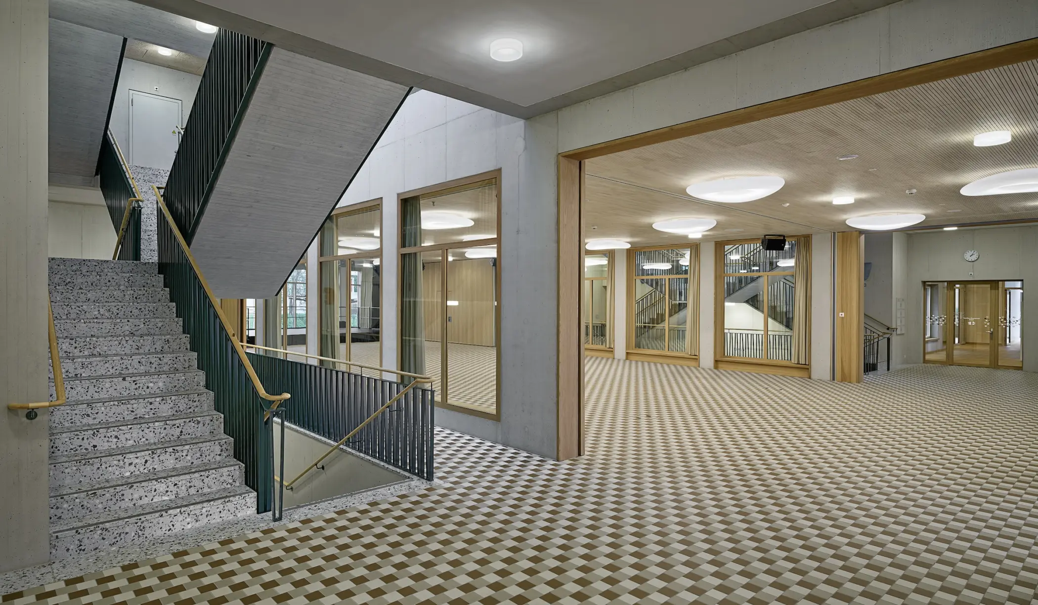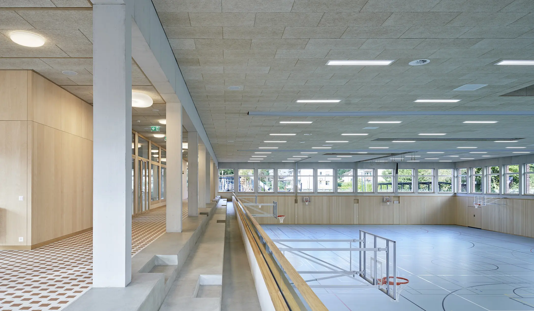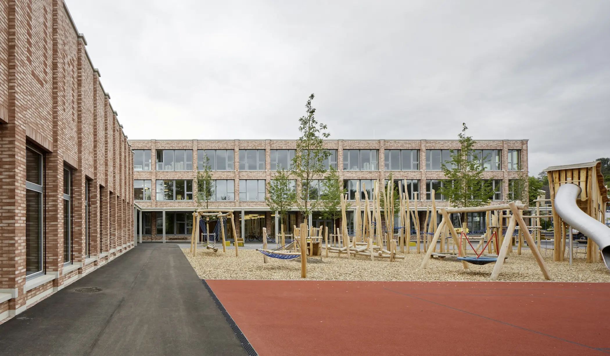 Im Schulhaus Surbaum gibt es darum eine Abfolge von abwechslungsreichen und geschickt angeordneten Wegen, die zu beruhigten Räumen – den spezifischen Schulräumen und Lernnischen – führen. Durch die Positionierung des Schulhauses und der Turnhalle im Gelände, wird die Schulanlage ins Quartier eingebettet und mit diesem vernetzt. Es entsteht ein zentraler und zusammenhängender Schulhof mit Sport- und Spielfeld als „grüne Mitte“ der Gesamtanlage.