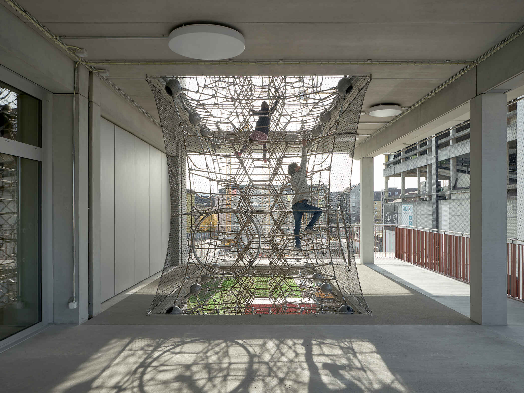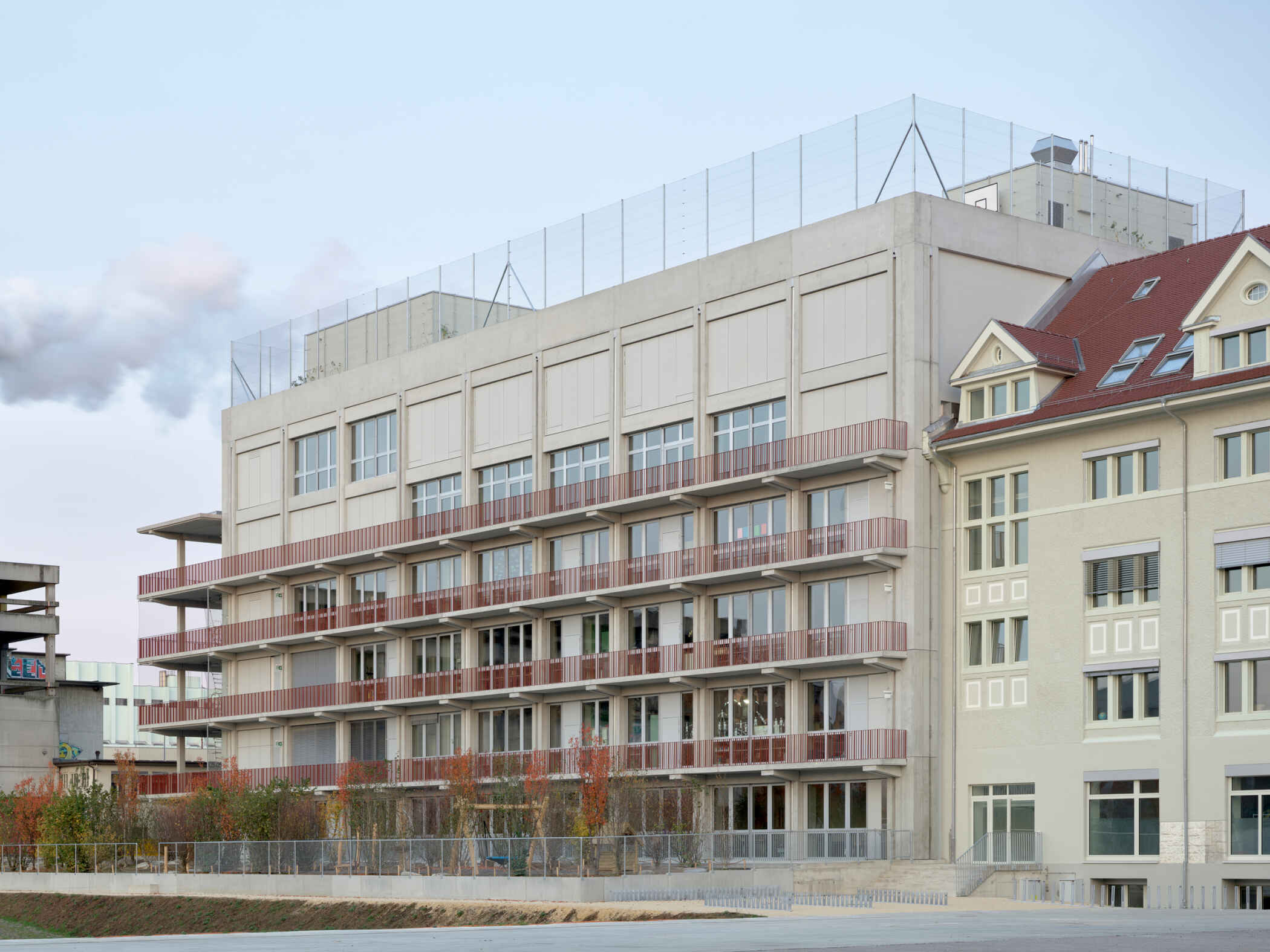 Aus dem einstigen Coop-Lagerhaus entstanden ein Haus für zwölf Klassen und zwei Kindergärten mit Räumen für die Tagesstruktur. Das bestehende Gebäude wurde bis auf das Tragwerk zurückgebaut und um zwei Stockwerke erhöht. Charakteristisch sind die umlaufenden Fluchtbalkone, die grossen Pausenterrassen von rund 100 m2 pro Stockwerk, eine dynamische äussere Treppenanlage und ein Kletternetz, das drei Stockwerke überspannt. In den aufgesetzten Geschossen befinden sich eine zweistöckige Aula und die Schulbibliothek.