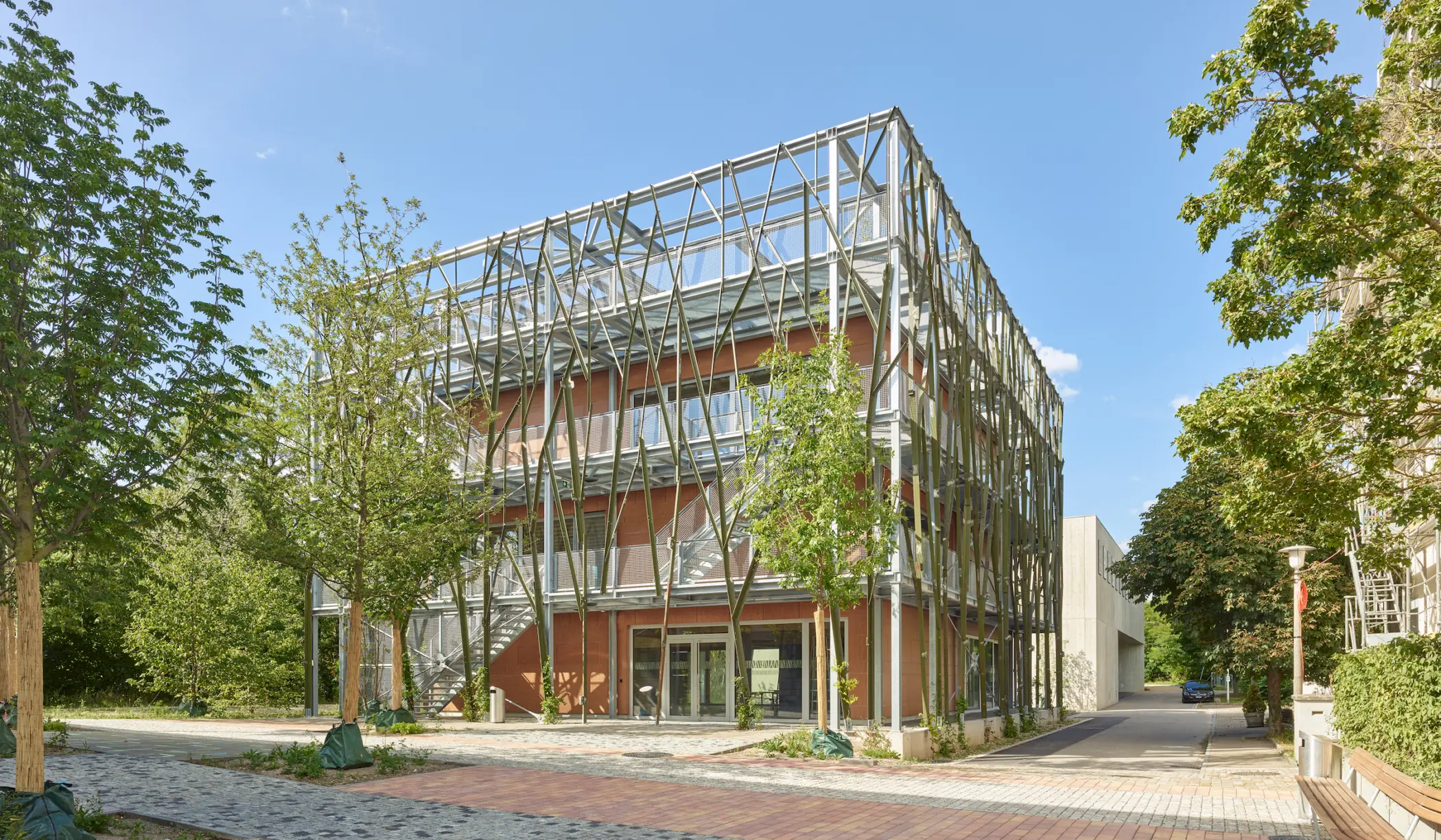 40% der weltweiten CO2 Emissionen gehen auf das Konto des Bausektors. Let’s change this! Klimagerechtes Bauen heisst auch Umnutzung statt Neubau. Der Grossteil der Bauteile des Re-Use-Pilotprojektes sind wiederverwendet, recycelt, aus nachwachsenden Rohstoffen, Restposten, B-Ware oder Abfallprodukte und stammen, wann immer möglich aus regionaler Herkunft. Material-Upcycling oder Design for Disassembly sind zentrale Themen. Die Umgebungsarbeiten bestehen zu über 90% aus Reuse-Material und wurden sogar mit einem Architekturpreis ausgezeichnet. Der Rundgang auf den drei Ebenen der Laubengänge ist auch ein architektonisches Erlebnis.