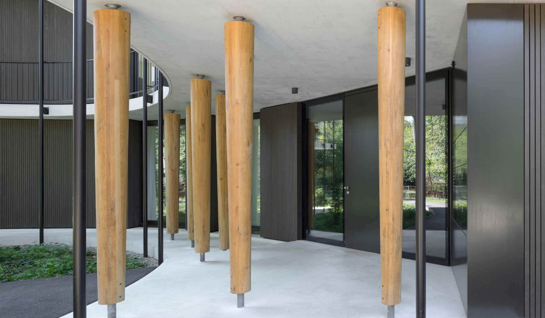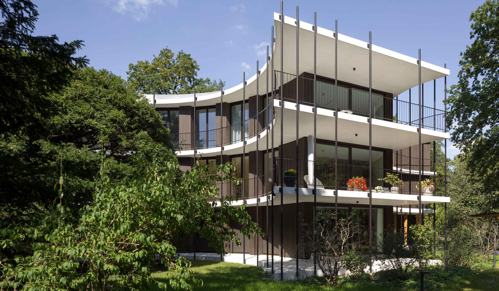 Die spezielle Gebäudeform, ein Polygon mit Einschnitten von Kreissegmenten, ist aus den notwendigen Abständen zu den Wurzelballen und Baumkronen der bestehenden, schützenswerten Bäume des parkartigen Grundstücks abgeleitet. Dadurch entstehen acht Geschosswohnungen mit unmittelbarem Aussenraumbezug, der über die umlaufende Balkonschicht unterschiedlicher Tiefe und die geschosshohen Öffnungen in der dunkel gestrichenen Holzfassade inszeniert wird. Dünne Stahlstützen zeichnen die auskragenden Geschossplatten in Weissbeton nach und wirken als filigraner Filter zwischen Gebäude und Park. In Kontrast zur organischen Gebäudeabwicklung ist die Struktur im Innern orthogonal ausgerichtet. Die Spannung zwischen äusserer Form und innerer Aufteilung verleiht dem Wohnhaus einen räumlichen und atmosphärischen Mehrwert. Ebenso die repräsentative Eingangshalle, deren massiver Langriemenboden sowie die Holztreppe mit kunstvollem Geländer einen adäquaten Charakter erzeugen.
