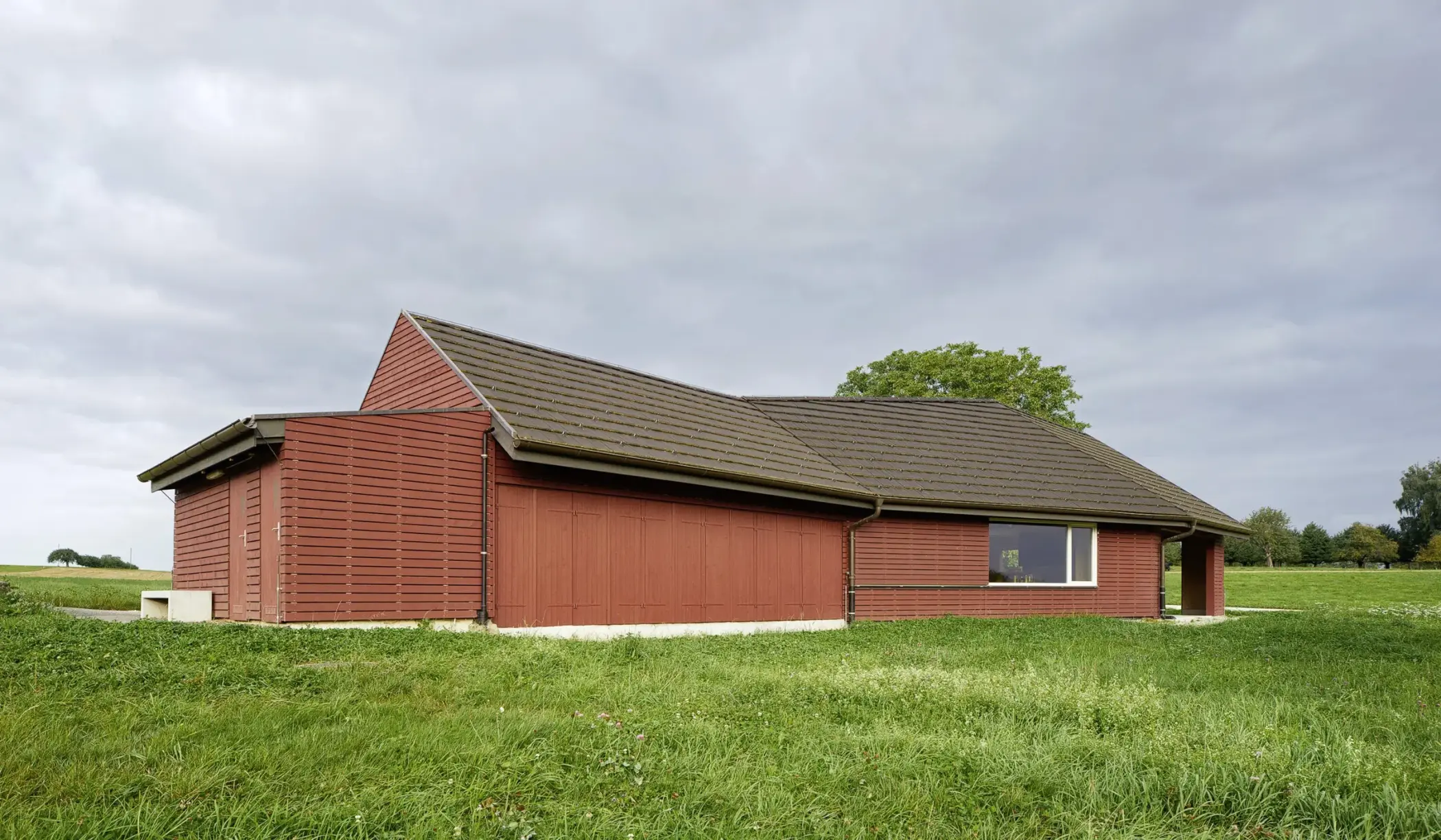 Das durch Brand beschädigte Gebäude wurde instand gesetzt und an die gewachsenen Bedürfnisse angepasst. Das neue Ensemble liegt in einer Senke der Landschaft und zeichnet sich durch eine eigenständige, mehrteilige Form aus: Schiessstand, gemeinschaftlicher Mehrzweckraum mit Aufenthaltsbereich und eine Halle mit Unterstand. Die zur Dorfseite orientierte Halle verbindet Innen- und Aussenraum, ist dreiseitig offen, überdacht und bietet Spaziergängern Schutz sowie Naturerlebnis. Neubau in Holzelementbauweise und erhaltener Bestand sind mit roter Fassadenschalung verkleidet, die als Einheit einen starken Akzent in der Landschaft bildet und einen klaren Kontrast zur grünen Umgebung schafft.