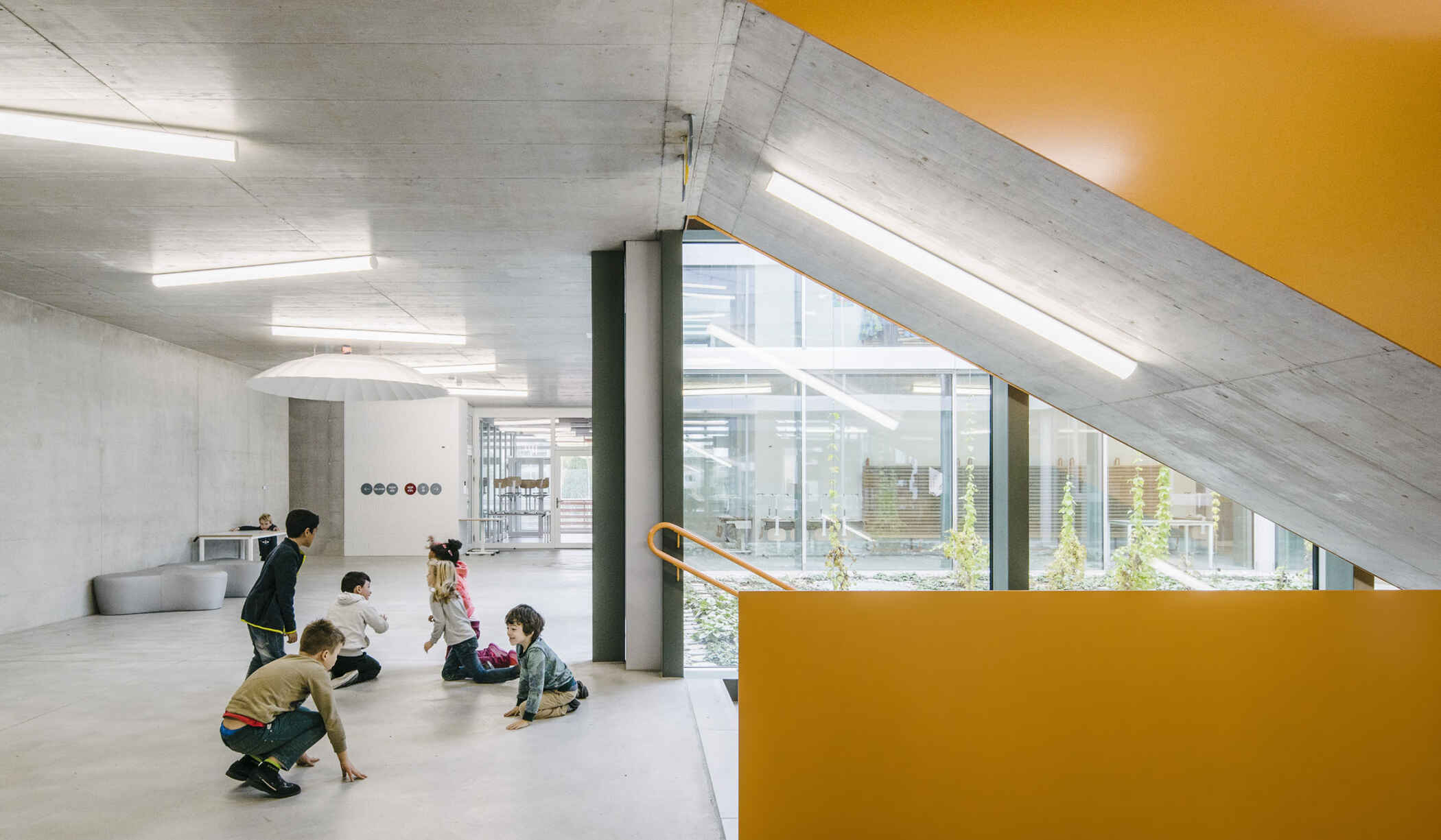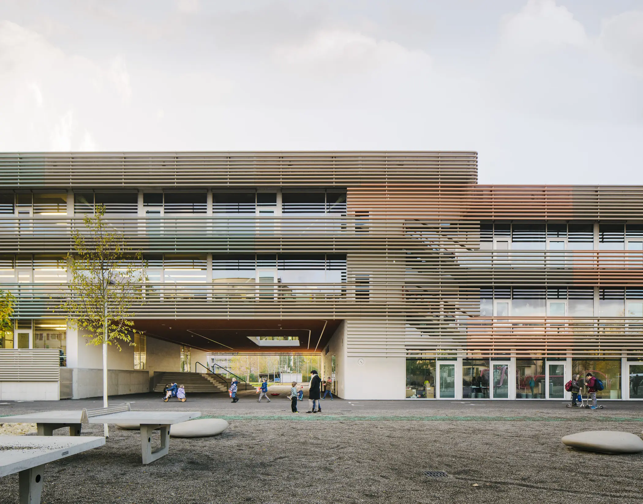 Die Einwohnergemeinde Allschwil hat als Antwort auf ihren grossen Bevölkerungszuwachs 2011 den Entscheid getroffen, ein Primarschulhaus für 600 Kinder zu bauen. Zwei Gebäude organisieren das umfangreiche Programm: das Schulhaus und das Hallengebäude. Das Schulhaus gliedert sich in drei beinahe unabhängige Teile: die beiden Bereiche für Unter- und Mittelstufe, welche über einen als statisch ausgebildeten Brückenbereich zusammengefügt werden. Letzterer überspannt die grosszügige, offene Pausenhalle. Im Brückenteil sind alle gemeinsam genutzten Räume angeordnet. Drei Lichthöfe zentrieren die jeweiligen Nutzungen und bringen viel Tageslicht in den tiefen Baukörper. Der Erschliessungsbereich kann für flexible und offene Unterrichtsformen genutzt werden. Als Orte mit unterschiedlichen Stufen von Intimität und Öffentlichkeit und ohne spezifische Funktion erweitern sie die pädagogischen Möglichkeiten.