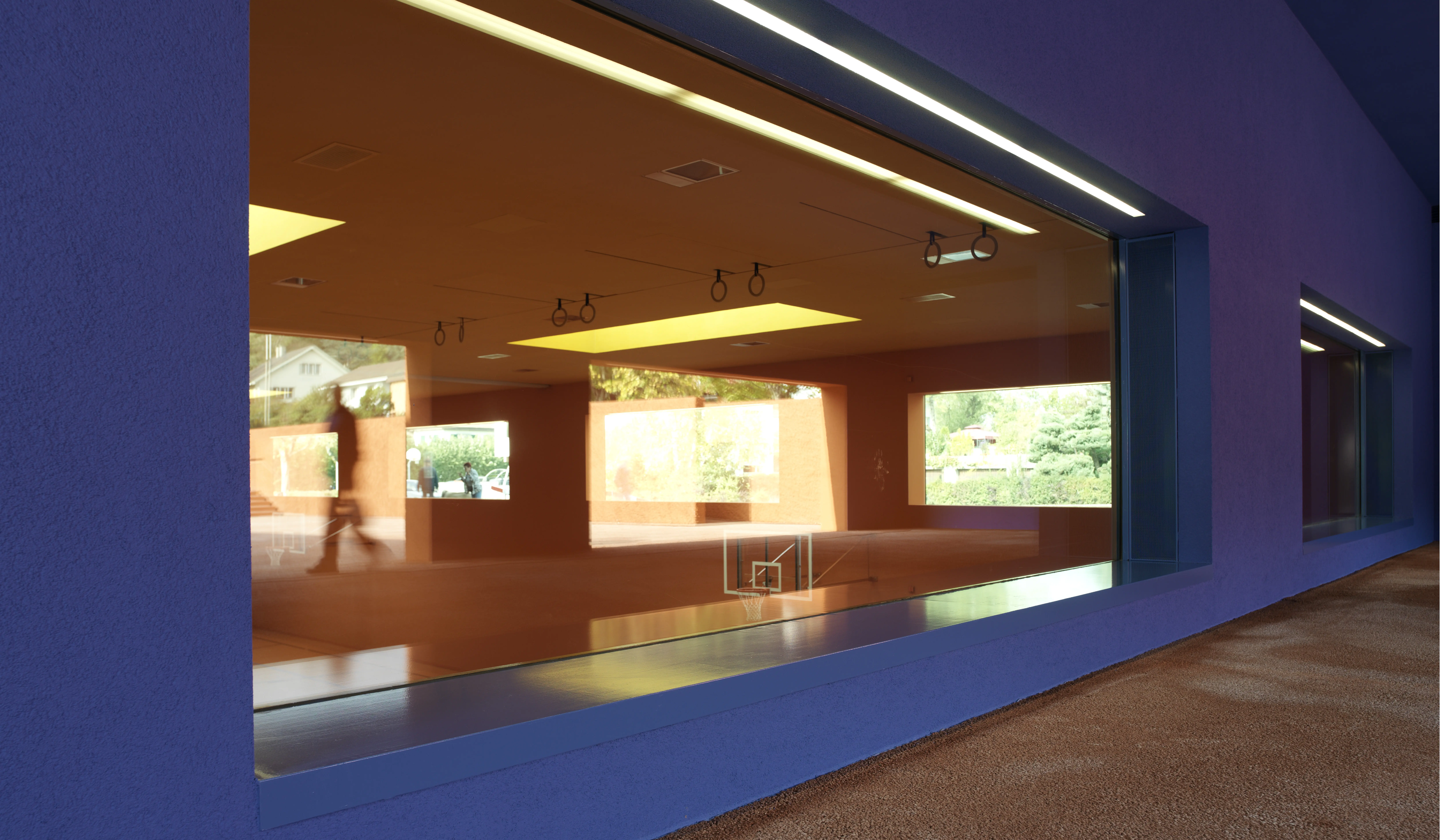 Das Primarschulhaus Hinter Gärten in Riehen befindet sich in einem Quartier, das von unterschiedlich hohen und einzeln stehenden Ein- und Mehrfamilienhäusern geprägt ist. Auf diese Umgebung hat der Luzerner Architekt Daniele Marques mit seinem modernen Schulhausbau reagiert: Das Gebäude setzt sich aus Einzelvolumen unterschiedlicher Höhe zusammen – der höchste Gebäudeteil beherbergt die Klassenzimmer, der mittlere die Turnhallen und der niederste die Veloparkplätze. Verbunden sind die Teile mit Passagen oder verschieden ausgestalteten Pausenhöfen. Gleichzeitig ist die Anlage durchgrünt, was die Schule mit den Gärten der Nachbarschaft verbindet. Die Konstruktion ist in Massivbauweise erstellt. Die Fassaden bestehen aus Beton und sind mineralisch in erdigen Farbtönen verputzt. Die Innenräume dagegen folgen einem auffälligen Farbkonzept, das die Orientierung im Schulhaus erleichtern soll.