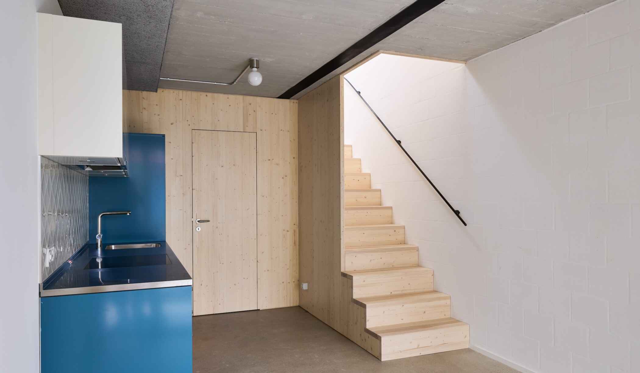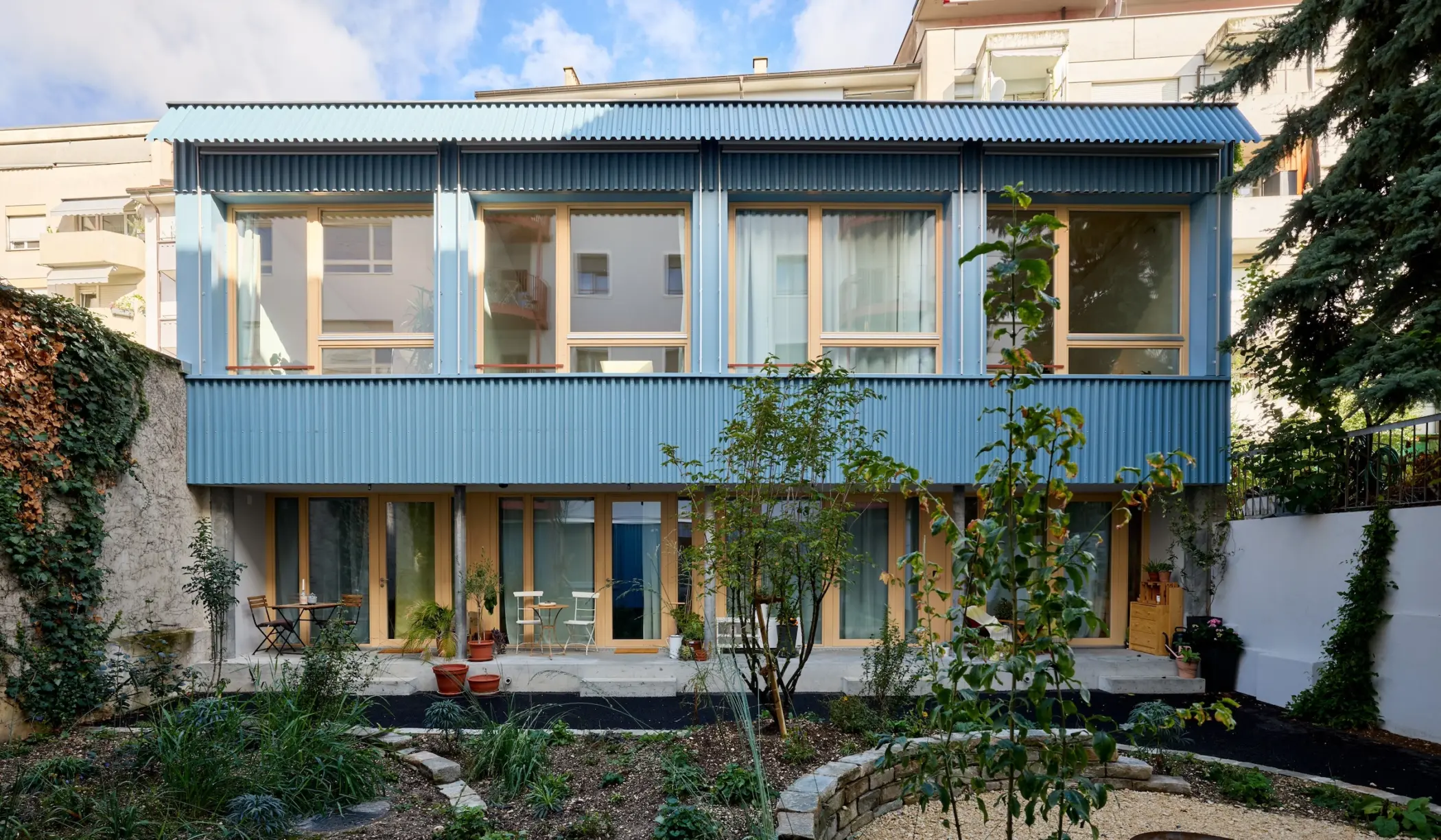Die Liegenschaft aus dem Jahr 1956 mit Wohnungen im Vorderhaus und einem ursprünglich gewerblich genutzten Hinterhaus wurde in bewohntem Zustand saniert. Dies umfasste den Einbau von neuen Küchen und Bädern, sowie der Ersatz der Steigzonen. Das bisher ungenutzte Dachgeschoss konnte mit einer Kleinstwohnung und einem Mansardenzimmer ausgebaut werden. Das an der belebten Strasse liegende Erdgeschoss wurde komplett neu organisiert. Die strassenseitig liegende Wohnung ist nun zum halbprivaten Hof hin, in die ursprünglichen Garagenboxen, eingebaut. Ein grosser Veloraum ist direkt von der Durchfahrt zugänglich und liegt an der Strassenfassade. Die sehr kleinen bestehenden Balkone auf der Hofseite sind mit einer Stahlkonstruktion erweitert worden. Das Hofgebäude mit Gewerbenutzung wurde unter grösstmöglicher Bestandswahrung für eine Wohnnutzung umgebaut. In das zweigeschossige Hinterhaus konnten geschickt 4 Tiny- Häuser, mit je 35m2 Nutzfläche eingefügt werden und die Gebäudehülle ist energetisch saniert. Die Hoffassade des Vorderhauses musste im Erdgeschoss ersetzt werden und erhielt im Zuge der Arbeiten grosszügige Fensteröffnungen.