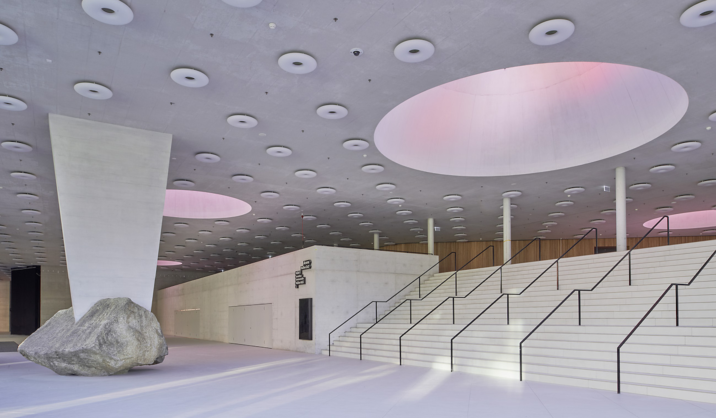 Die Sanierung der St. Jakobshalle bot die Chance, die seinerzeit vorbildliche Halle aus den 1970er- Jahren an heutige Anforderungen anzupassen. Der Charakter der Halle sollte erhalten bleiben und mit den Neubauten zu einer klaren starken Identität entwickelt werden. Das neue Projekt vermittelt den Eindruck, als sei es von Anfang an so gewesen. Die sanierte St. Jakobshalle erhielt einen neuen grosszügigen Haupteingang. Der Entwurf verdeutlicht mit dem weit aufgespannten Dach über dem Eingang die öffentliche Funktion der Halle. Das bestehende Dach der Eingangshalle wurde ringsum erweitert, raumhaltig und beinhaltet neu die notwendige Haustechnik. Im Inneren nimmt ein doppelgeschossiges Foyer die Menschenmasse auf. Grosse Kuppeln im Eingangsbereich betonen den hohen und hellen Raumeindruck.
