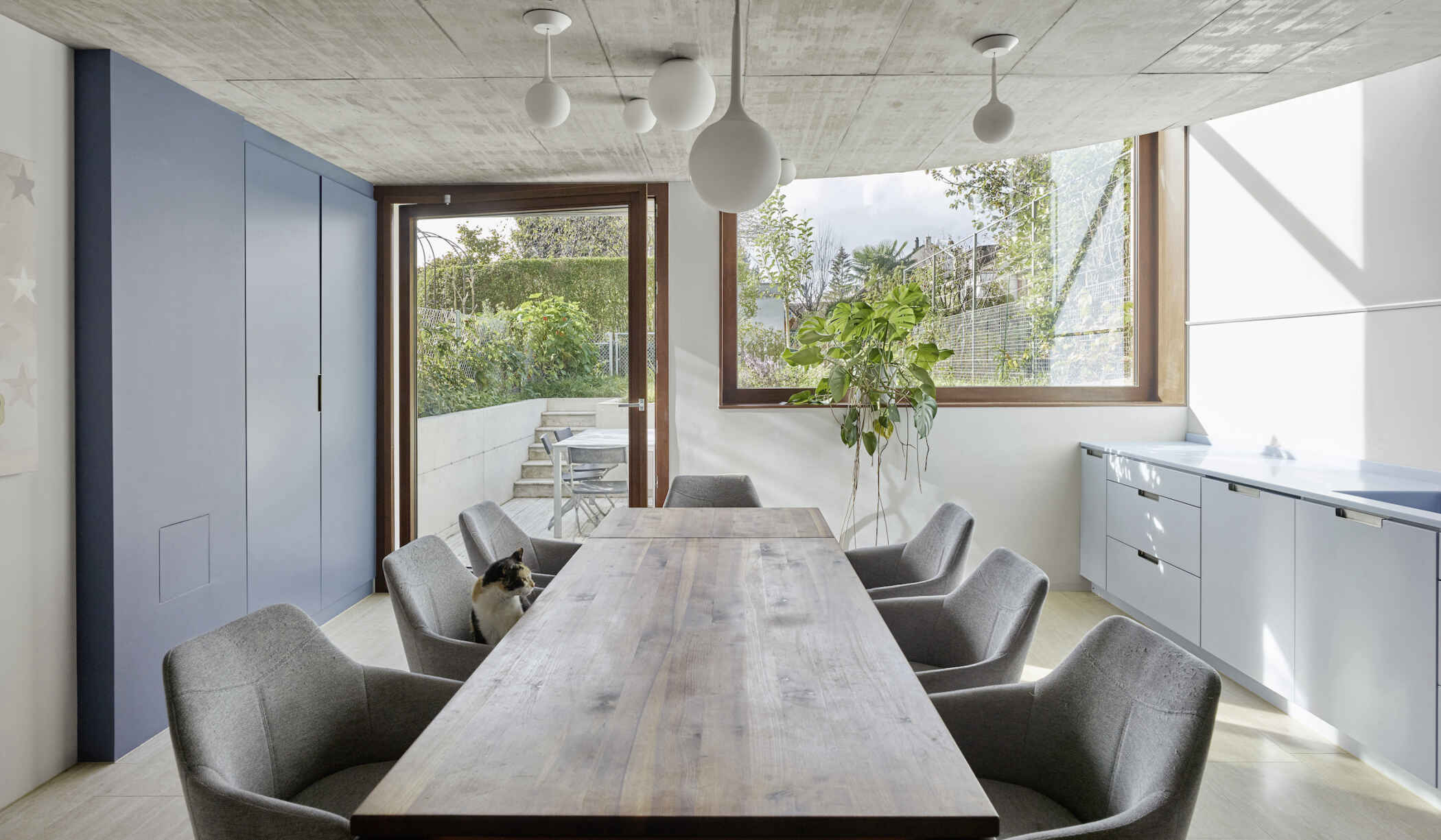 Die Haupträume des Hauses – Entrée, Speisezimmer mit Küche, Wohnraum und Bibliothek – werden auf verschiedenen, halbgeschossig versetzten Ebenen angeordnet. Der Speiseraum und seine Terrasse werden in den Garten eingebettet. Der mit ihm verbundene, darüber liegende Wohnraum, leicht über dem Hof erhaben, lässt den Blick nach Aussen schwenken. Die Bibliothek öffnet sich mit ihrer grosszügigen Fensterfläche zur Strasse und trägt somit zum öffentlichen Charakter der Strassenfassade bei. Der Treppenraum schwingt sich mit den kurzen, halbgeschossigen Läufen in die oberen Etagen weiter und endet im Dachgeschoss mit seinen grosszügigen Terrassen, welche die Dachlandschaft des Quartiers erlebbar machen.