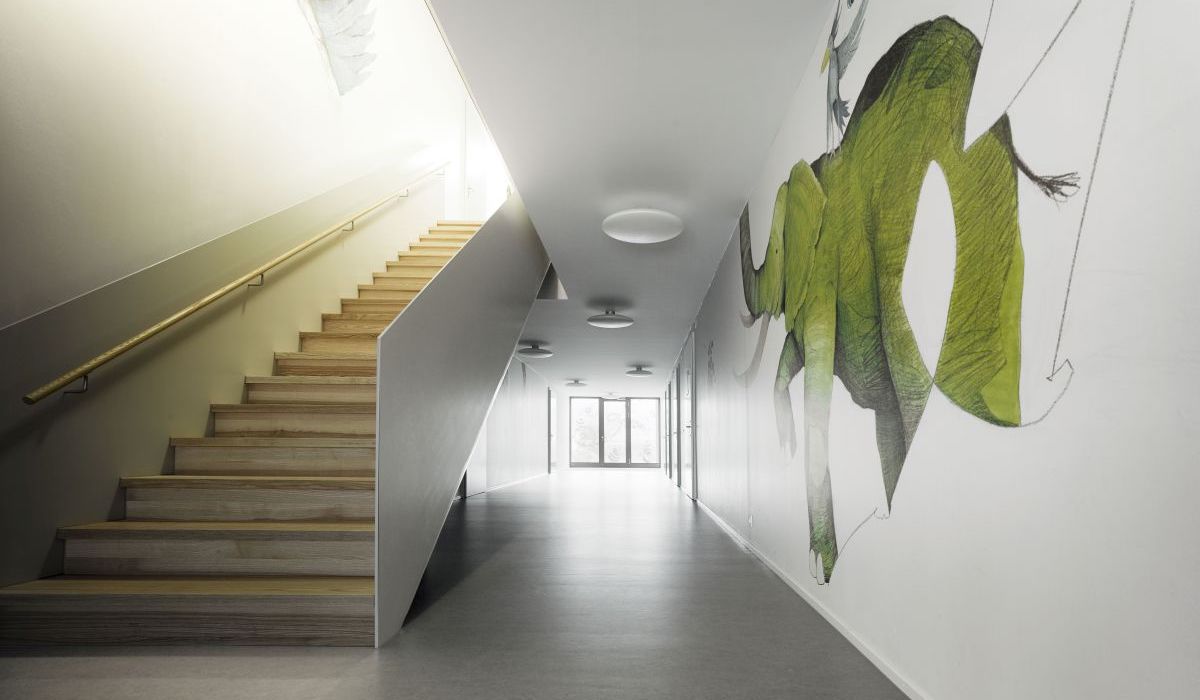 Der Doppel-Tageskindergarten ist einer von mehreren neuen Kindergärten in Allschwil, die als Bildungs- und Erziehungsstätte für Kinder von vier bis acht Jahren konzipiert ist. Der zweigeschossige Holzbau mit Tagesstruktur wurde barrierefrei angelegt. Neben den Gruppenräumen dienen die grosszügig gestalteten Erschliessungsbereiche als Aufenthalts- und Spielzone. Die Innenwände mit Illustrationen von Philipp Zurmöhle sind vom Dschungel inspiriert, farbliche Akzente werden mit grünen Oberflächen innen und aussen gesetzt. Zwei gedeckte Terrassen ermöglichen Aktivitäten an der frischen Luft auch bei nassem Wetter. Die verspielte Fassade besteht aus einer Deckleistenschalung, bei welcher die Holzlatten in unregelmässigen Abständen und Farben seitlich gestrichen wurden. Dank dem hohen Ausbaustandard (Minergie-P) sowie der auf dem Dach installierten PV-Anlage funktioniert das Gebäude nahezu energieautark.