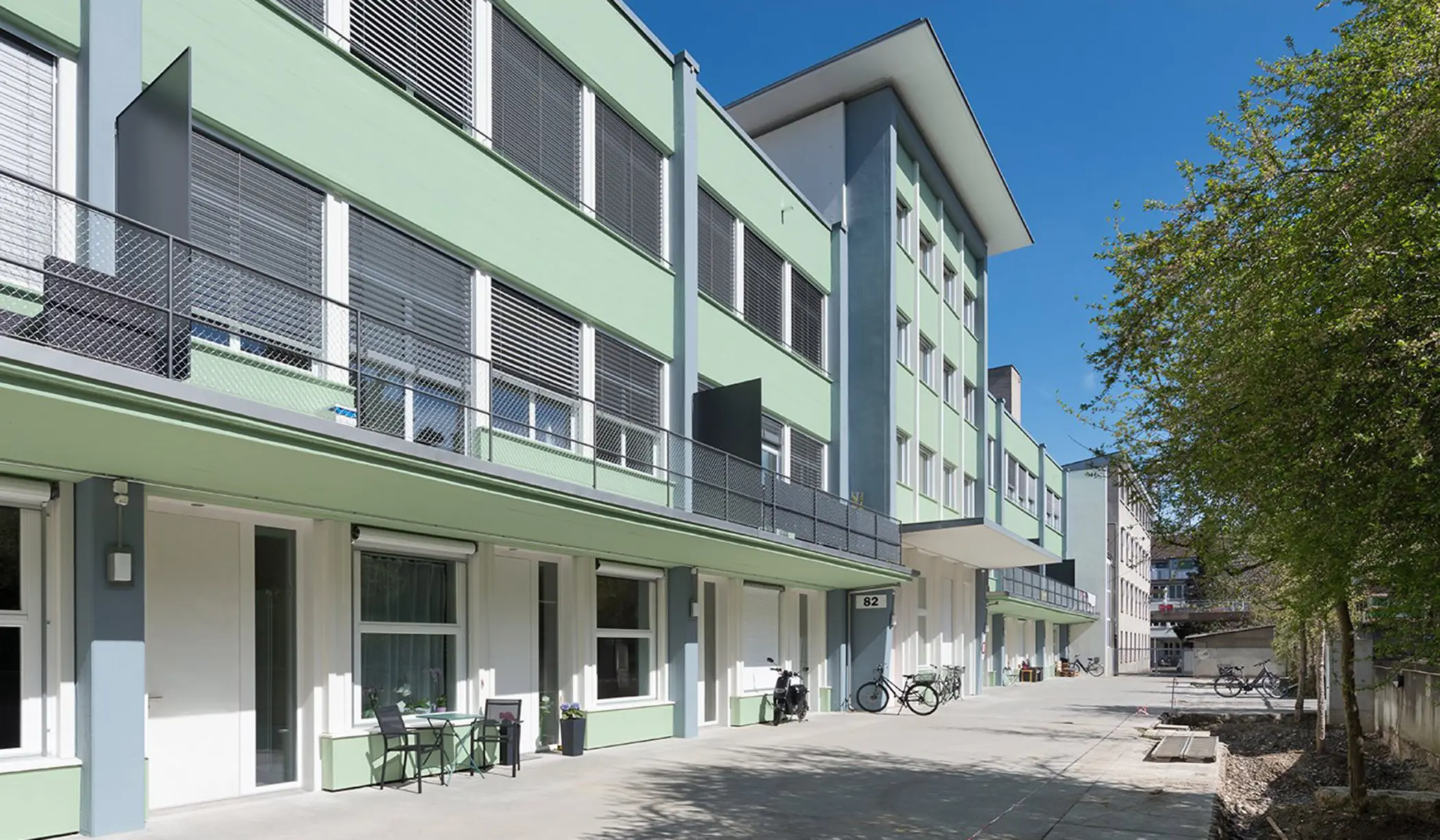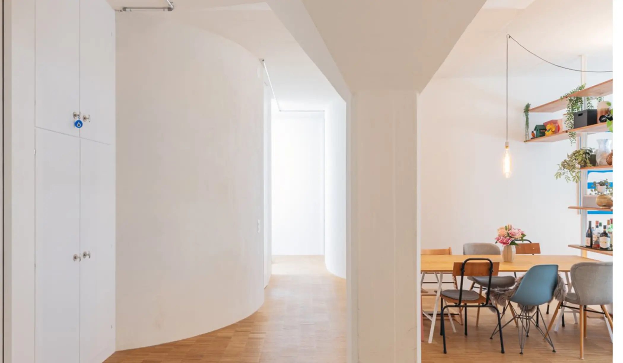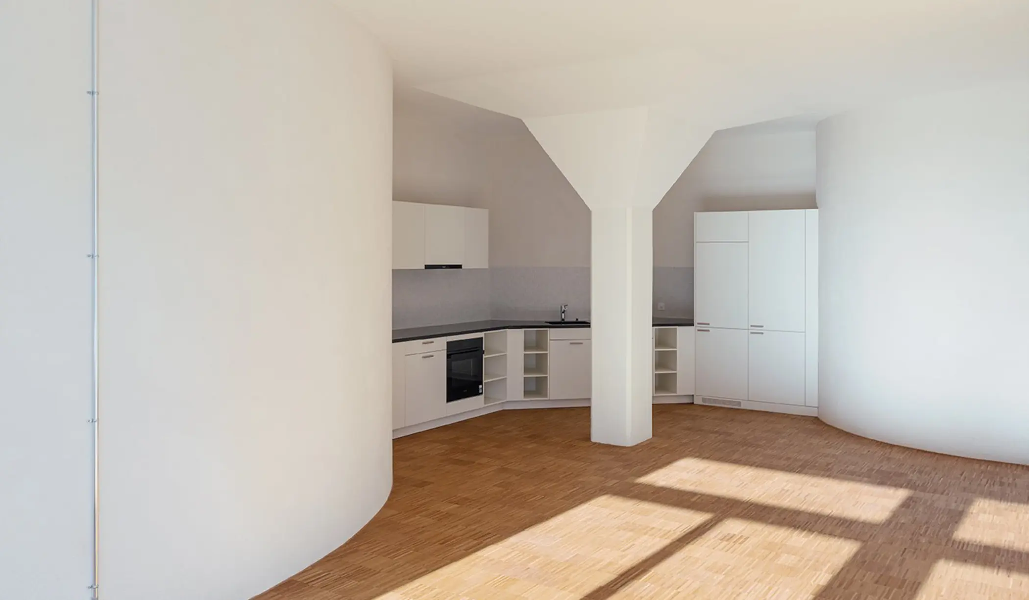 Nachhaltigkeit bedeutet hier die möglichst unveränderte Wiederverwertung des Bestandes. Die robuste Tragstruktur ermöglicht ein freies Setzen von Wänden und unterschiedlich grosse Wohnungen. Gerundete Raumtrennungen führen das Licht sanft in die Tiefe. Der erhaltene Erschliessungskern strukturiert den neuen Grundriss.