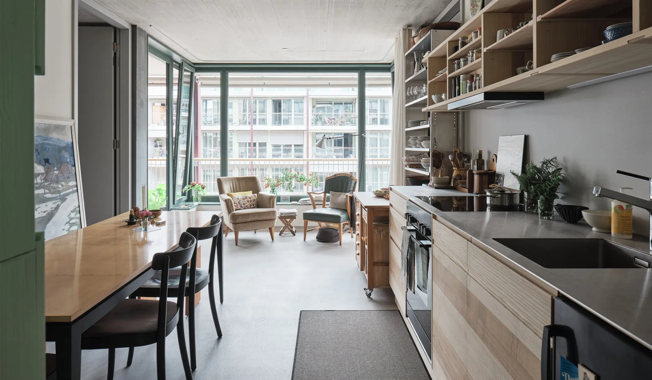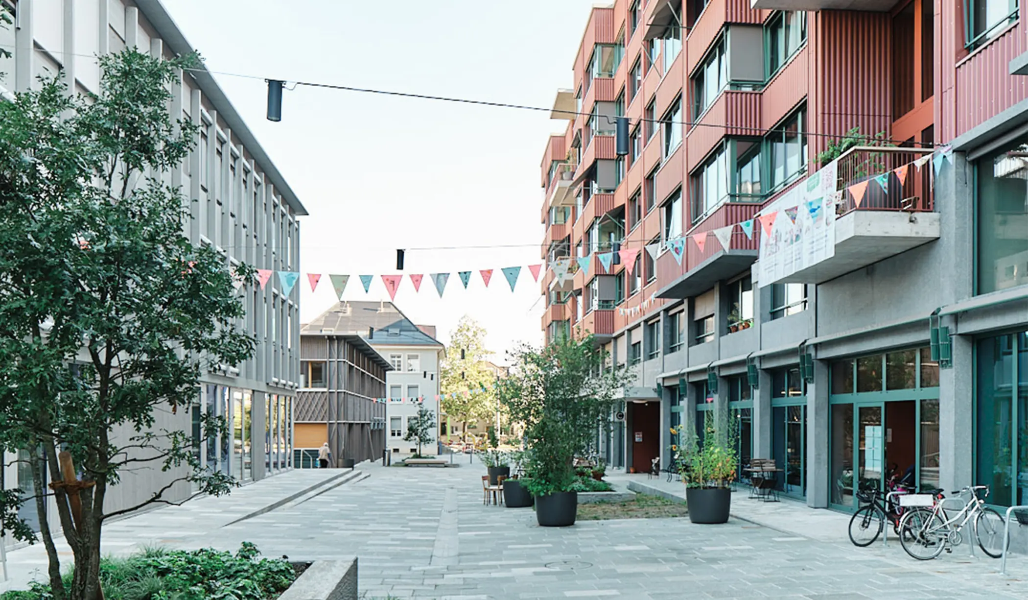 Die Bau- und Wohngenossenschaft Lebenswerte Nachbarschaft (LeNa) realisierte mit der Baugenossenschaft wohnen&mehr auf dem Westfeld in Basel ein zukunftsweisendes Wohnprojekt. Das LeNa-Haus bietet seit Frühling 2023 Wohnraum für aktuell rund 170 Personen, die an einem gemeinschaftlichen Zusammenleben und einem nachhaltigen Lebensstil interessiert sind. Es gibt eine breite Palette von Wohn- und Haushaltsformen: von Einzelzimmern und Wohnateliers über Familienwohnungen bis zu Wohngemeinschaften und Cluster-Wohnungen. Der Neubau wurde bewusst mit reduzierten individuellen Wohnflächen – 32 m2 pro Person, inklusive Balkon und Gemeinschaftsflächen – konzipiert. Stattdessen setzt die Genossenschaft auf das Teilen von Infrastruktur sowie auf eine nachhaltige Alltagsversorgung mit Lebensmitteln, die unter anderem mit einem solidarischen Landwirtschaftsprojekt zusammen mit einem Bauernhof aus der Region erreicht wird.