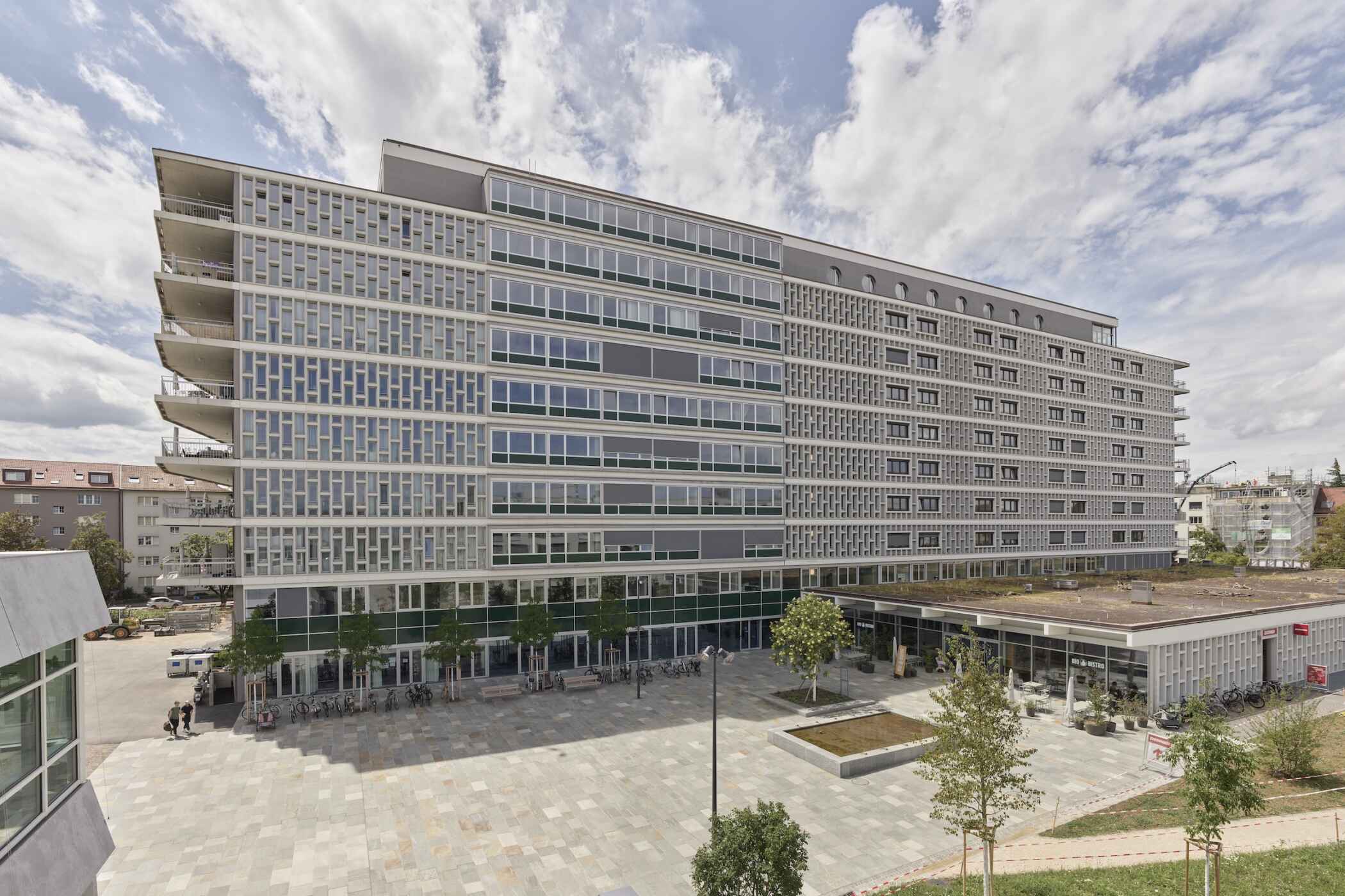 Umnutzen statt abbrechen! Nachdem das ehemalige Felix Platter-Spital aus den 1960er-Jahren unter Denkmalschutz gestellt war, begann der Umbau in ein sogenanntes «Miteinanderhaus». Eine Kaskadentreppe zieht sich durch das gesamte Gebäude: vom Erdgeschoss mit seinem einladenden Foyer und den Gewerberäumen sowie Quartier- und Nachbarschaftsangeboten über die Wohnetagen bis zum Gemeinschaftsraum mit Dachterrasse, der von den Bewohner*innen genutzt wird.