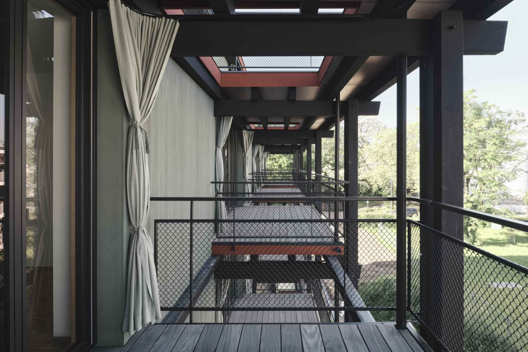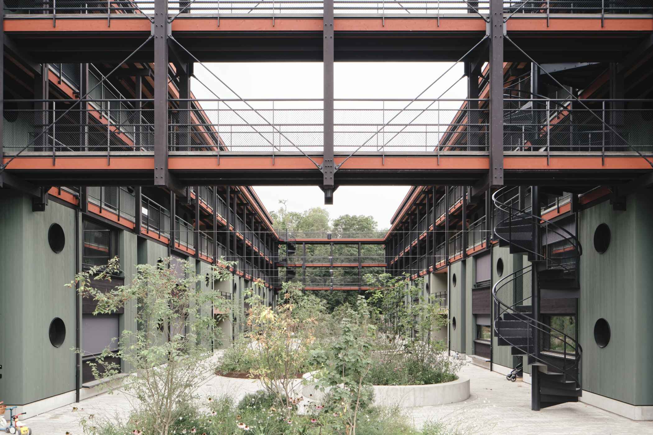 Zwei parallel liegende Häuser fassen einen zentralen Hofraum, der als verbindender Freiraum dient und die Nachbarschaft fördert. Im Gegensatz zu klassischen Zeilenbauten entstand hier ein Ort mit klarer Identität. Der Hofraum wird durch parkartige Grünflächen mit Spielwiesen und Spielplätze ergänzt. Die Wohnungen sind über einen offenen Laubenkranz erschlossen. Die vertikale Erschließung erfolgt über zwei Haupttreppenhäuser und zwei Lifte, ergänzt durch zwei Spindeltreppen. Das Projekt bietet eine Vielzahl an Wohnungstypen, darunter familienfreundliche Maisonetten und kompakte Studiowohnungen. Die Mischbauweise kombiniert die Vorteile von Massiv- und Holzbau und schafft ein ansprechendes Raumklima. Die klar gegliederten Räume fördern die Interaktion der Bewohner.