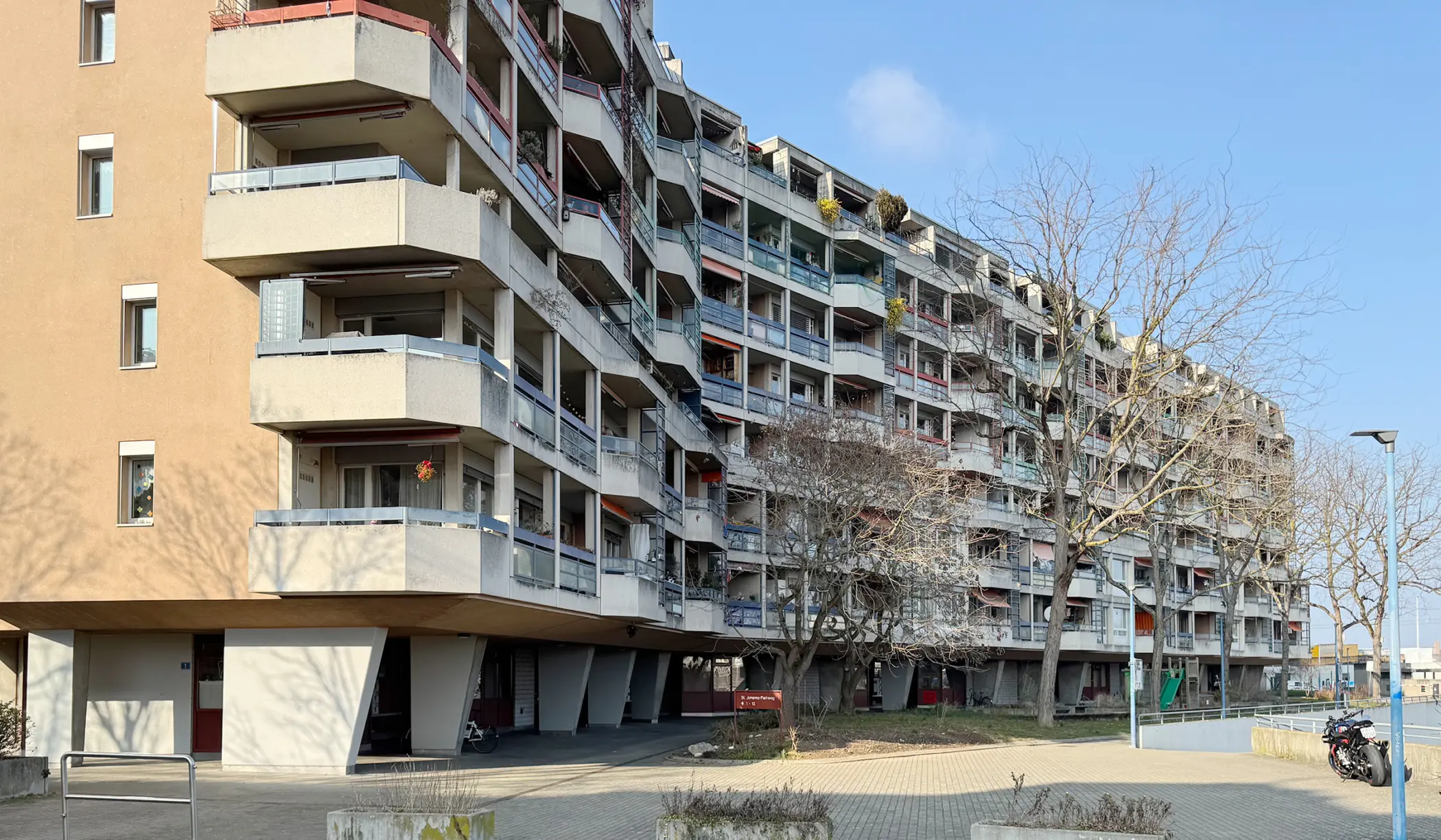 Im Jahr 1986 wurde die Wohnbebauung St. Johanns-Parkweg 1 bis 13 vom Architekten Walter Wurster mit ca. 100 Wohnungen fertiggestellt. Zwischen dem St. Johanns-Park und der Dreirosenbrücke besetzt dieser siebengeschossige, mäanderförmige Wohnblock eine äusserst prominente Lage. Er wurde im Zuge der Überbauung vom ehemaligen Schlachthof-Areal geplant. Zu dem Gesamtensemble der Anlage gehören das Altersheim, der Veranstaltungssaal Rhypark und ein flacherer Bau entlang des Rheins mit Maisonettewohnungen. Als einer von vier Baurechtsnehmern war der Wohnbau-Genossenschaftsverband Nordwest mit 44 Wohnungen am Wohnblock beteiligt und besitzt mittlerweile das gesamte Gebäude. Die unterschiedlich grossen Wohnungen zeichnen sich durch effiziente und sorgfältig durchdachte Grundrisse aus. Der Bezug zum Rhein ist durch grosszügige Fenster und eine differenzierte Ausgestaltung der Balkone hervorragend ausformuliert.