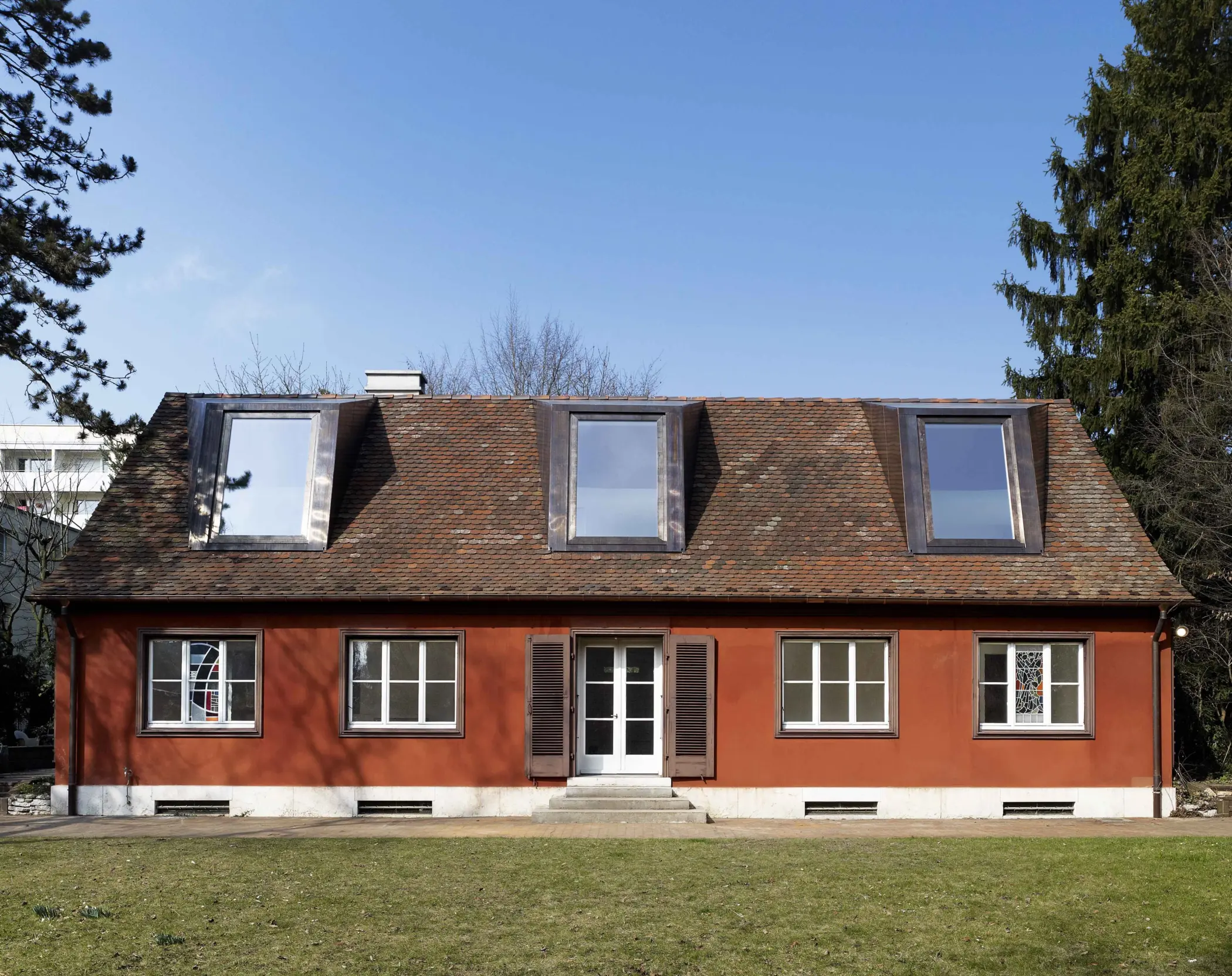 Das um 1925 von Hans Bernoulli als privates Wohnhaus entworfene Einfamilienhaus liegt auf einer vom Strassenraum abgeschirmten Parzelle mit introvertierter Gartenanlage. Typisch für die Entstehungszeit sind die rational entwickelte, kammerartige Grundrissstruktur und die strenge Symmetrie, die sich in der Fassadengliederung der Längsseiten widerspiegelt. Der Umbau interpretiert diese Ordnung neu: Im Erdgeschoss ersetzen zwei freigestellte Einbauten mit Küche, Bad und Erschliessung die kleinteilige Raumstruktur. Unterzüge markieren die ehemaligen Wandachsen und verweisen auf den Bestand. Das Dachgeschoss wird in einen Eltern- und einen Kinderbereich gegliedert; drei Schleppgauben erweitern die Räume zum Garten und bringen Licht in den Dachraum. Kupfer akzentuiert die bestehende Materialität und schärft den warmen Farbkanon aus Tonziegel, Kalkstein und Kalkputz, während im Inneren ein helles, weiss gefasstes Raumkontinuum für neue Grosszügigkeit sorgt.