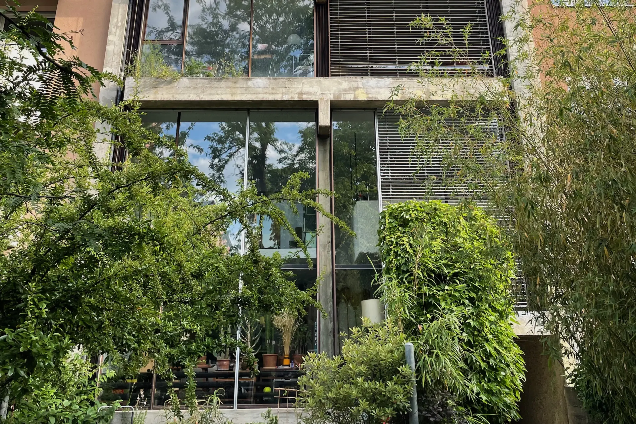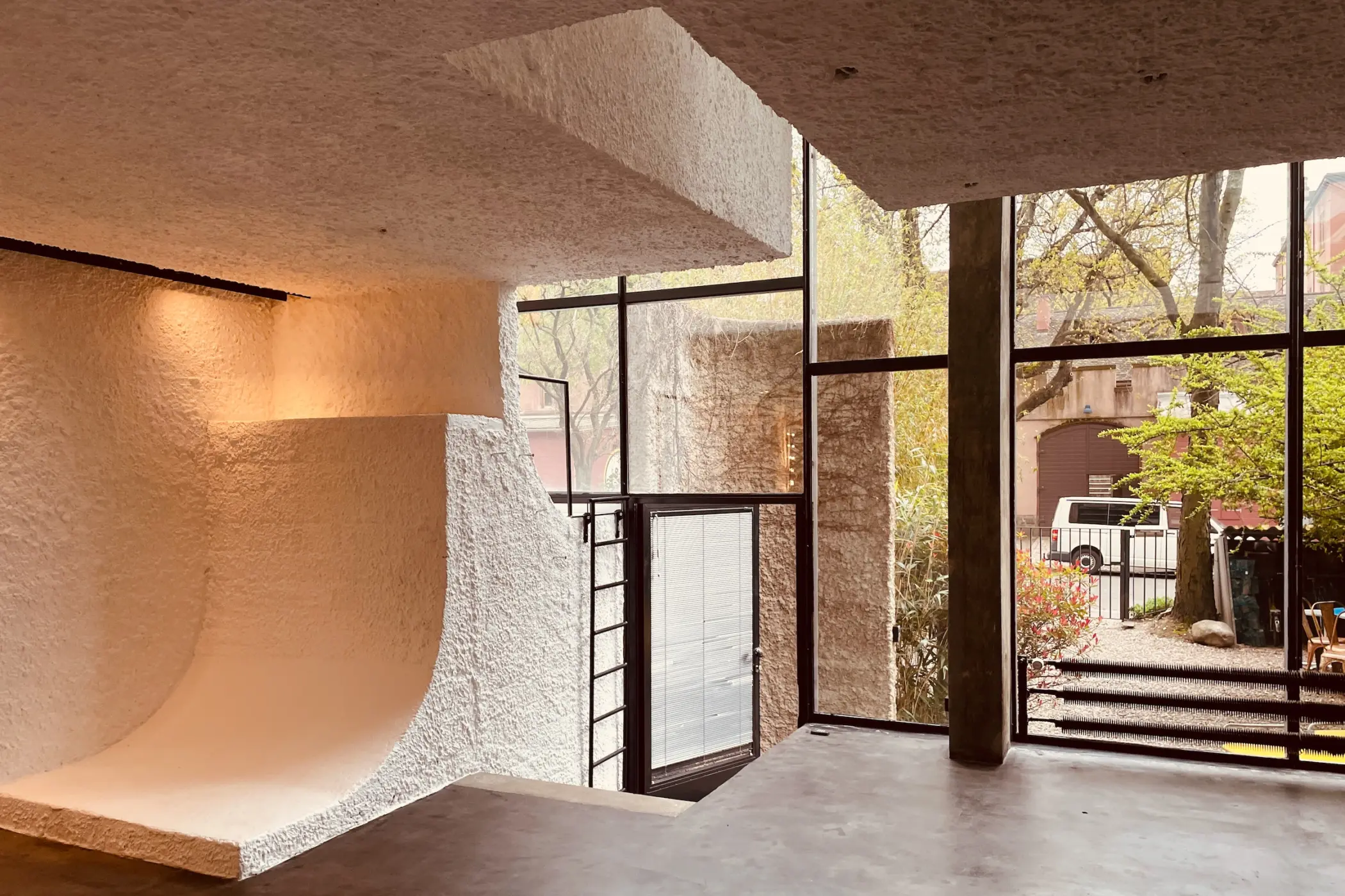 Ein gewerblicher Kleinbetrieb wurde in überraschender Selbstverständlichkeit in die Wohnzone, aber auch in die Struktur des Hauses integriert. Auf einem kleinen Grundriss ist ein Optimum an architektonischer Aussage erreicht worden, wobei die Betonarchitektur eine erfrischende Ursprünglichkeit bewahrt hat. Ohne aufwändige Mittel ergaben sich trotz örtlicher Beschränkungen phantasievolle Raumabfolgen in horizontaler und vertikaler Richtung.