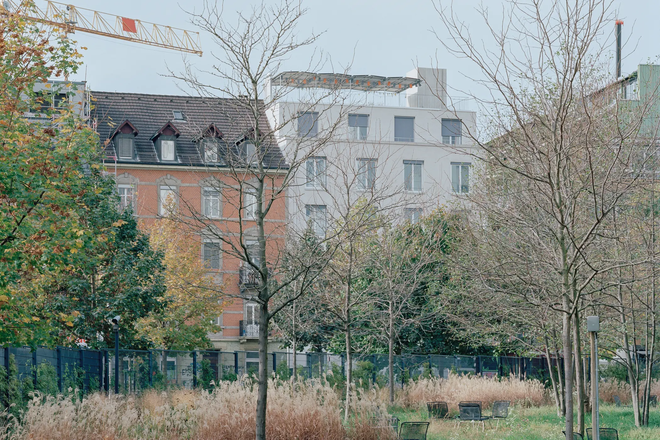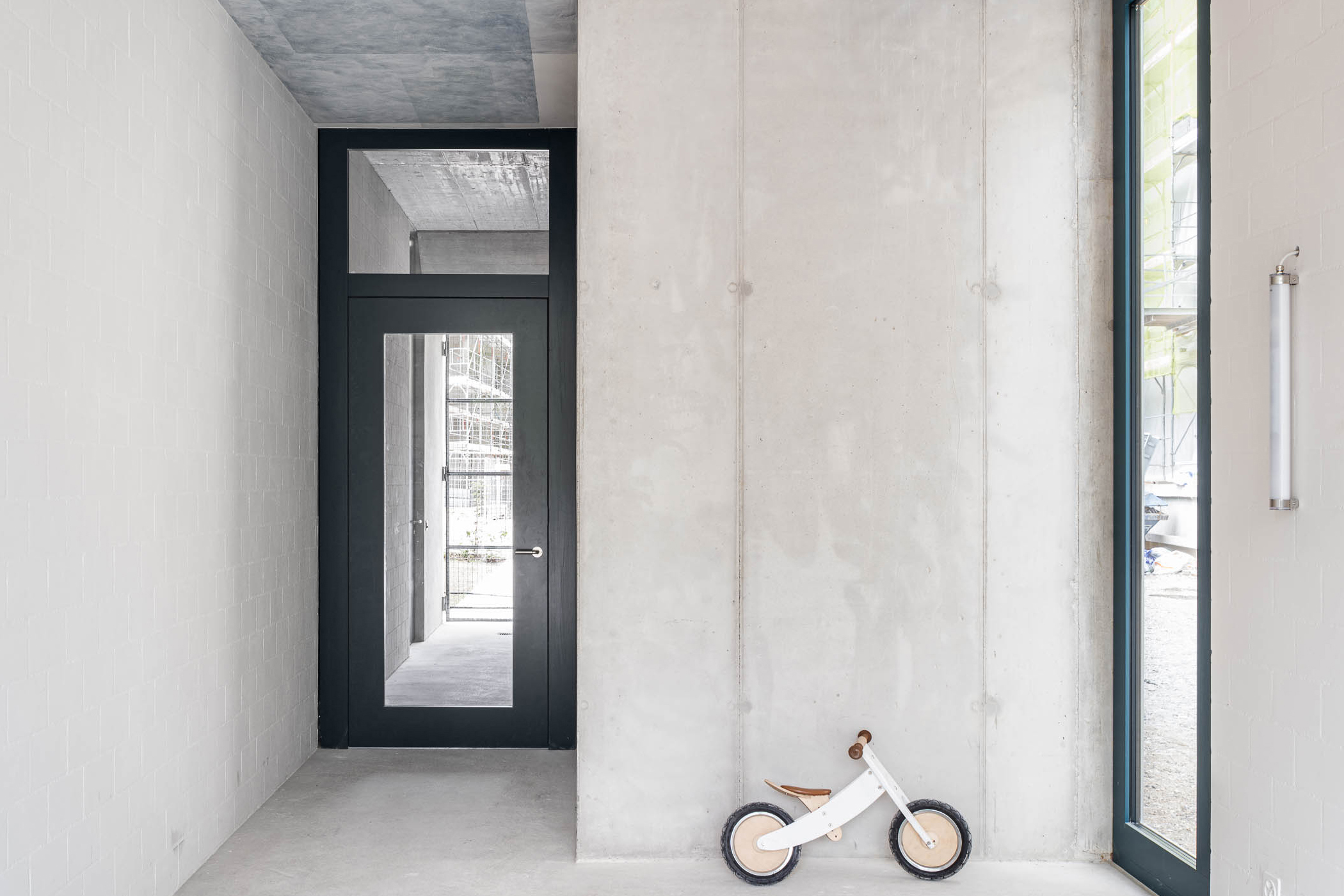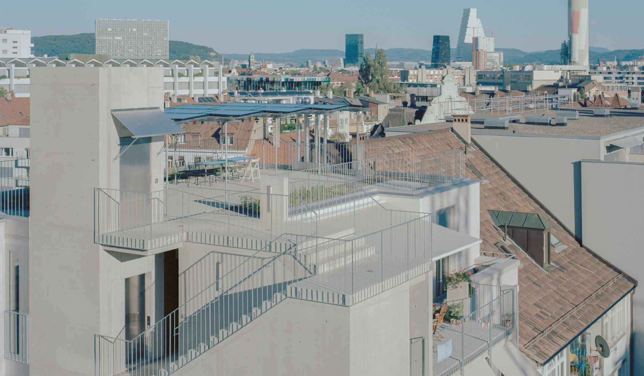 Auf dem ehemaligen Industrieareal Lysbüchel Süd entsteht ein neues Wohnquartier. Die gewachsene Blockrandstruktur der Stadt trifft hier auf grossmassstäbliche Solitärbauten des 20. Jahrhunderts. Die Parzelle nimmt im Kontext der historischen Strukturen eine Sonderstellung ein. Einerseits bildet sie das letzte Glied einer Kette von fünfgeschossigen Wohnbauten, andererseits leitet sie zur grossmassstäblichen Bebauung des benachbarten Industrieareals über. Das offene Treppenhaus mit seinem aufstrebenden Liftschacht ist das zentrale gemeinschaftliche Element des Hauses. An diesem offenen Begegnungs- und Erschliessungsraum werden alle Wohnungen und alle Balkone mit dem gemeinschaftlichen Garten und der Dachterrasse verbunden. Um der nachhaltigen Flächennutzung gerecht zu werden, können die Geschosswohnungen mit einem Zugang über den Balkon bei Bedarf in zwei separate Einheiten unterteilt werden.