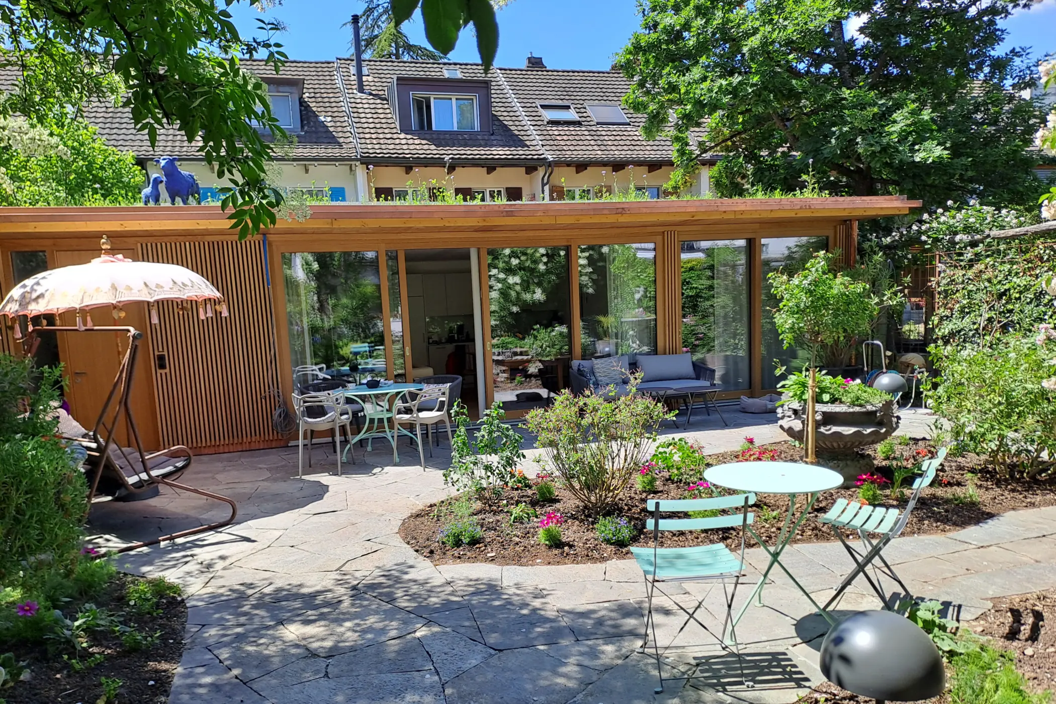 An der Hirzbrunnenstrasse 16 standen im Garten des 7-Zimmer-Eckeinfamilienhauses aus den 1930er-Jahren vier Autogaragen. Da das Vorderhaus nur noch von der Besitzerin und ihrem Mann bewohnt wurde, haben sie diese in einen «Alterssitz» umgebaut und das Vorderhaus der Tochter und ihrer Familie überlassen. Neben diesem Generationenmodell spielte auch das Konzept des verdichteten Bauens eine Rolle.